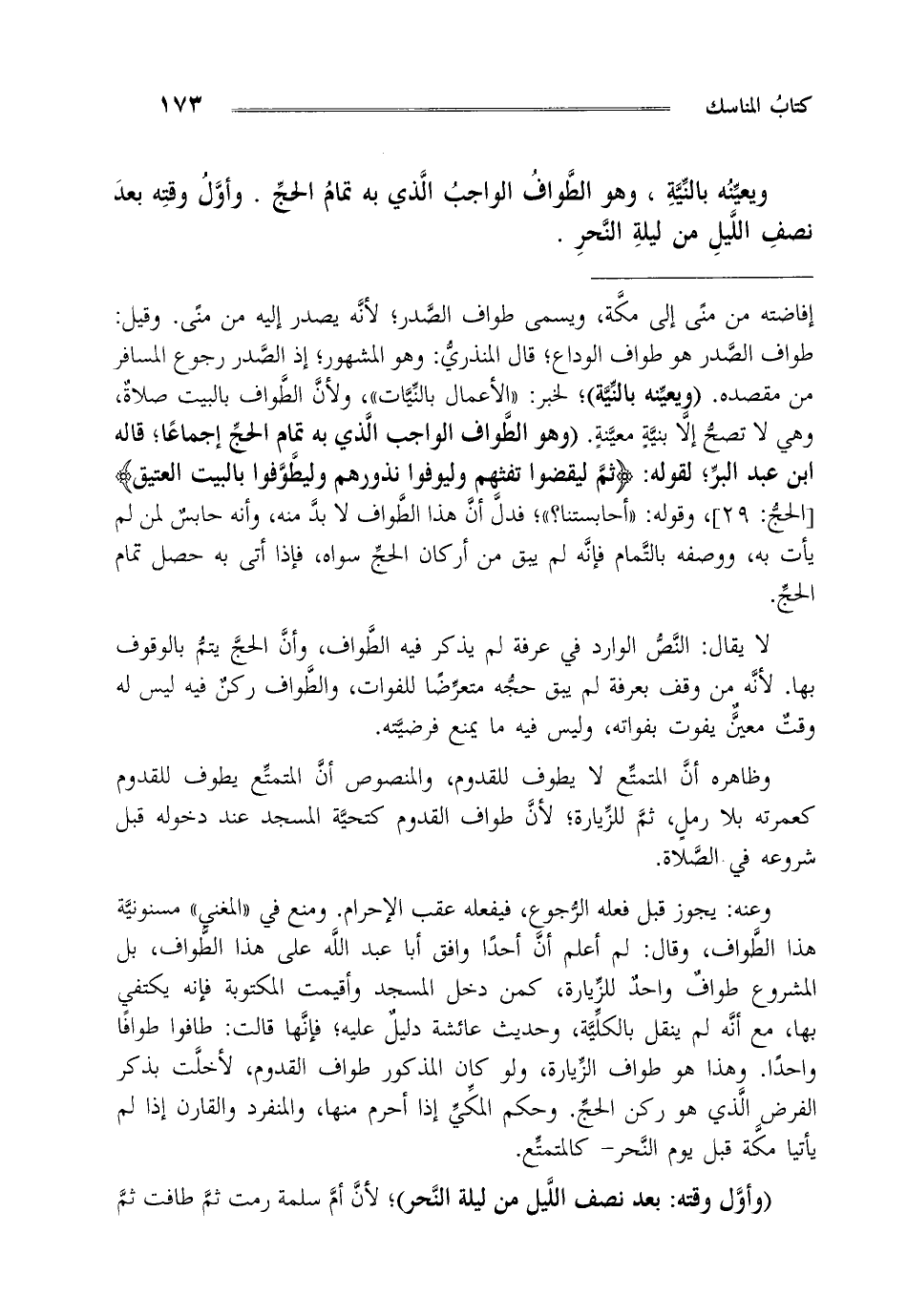 إفاضته من منى إلى مكة ويسمى طواف الصدر لأنه يصدر إليه من منى وقيل طواف الصدر هو طواف الوداع قال المنذري وهو المشهور إذ الصدر رجوع المسافر من مقصده. "ويعينه بالنية" لخبر: "الأعمال بالنيات" ولأن الطواف بالبيت صلاة وهي لا تصح إلا بنية معينة. "وهو الطواف الواجب الذي به تمام الحج إجماعا" قاله ابن عبد البر لقوله: {ثُمَّ لْيَقْضُوا تَفَثَهُمْ وَلْيُوفُوا نُذُورَهُمْ وَلْيَطَّوَّفُوا بِالْبَيْتِ الْعَتِيقِ} [لحج: 29]، وقوله: "أحابستنا؟" فدل أن هذا الطواف لابد منه وأنه حابس لمن لم يأت به ووصفه بالتمام فإنه لم يبق من أركان الحج سواه فإذا أتى به حصل تمام الحج.