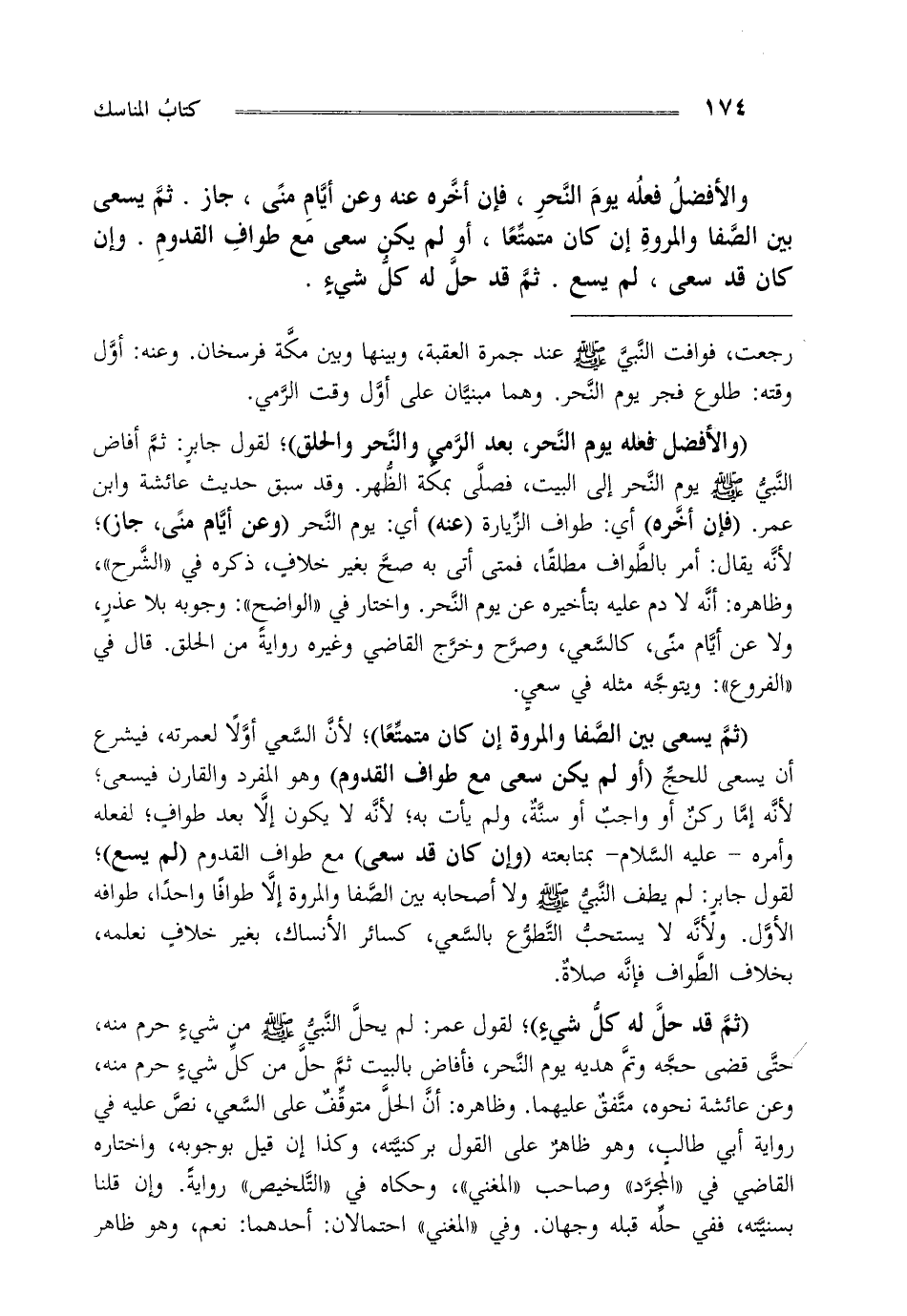 "ثم قد حل له كل شيء" لقول عمر: لم يحل النبي صلى الله عليه وسلم من شيء حرم منه حتى قضى حجه وتم هديه يوم النحر فأفاض بالبيت ثم حل من كل شيء حرم منه وعن عائشة نحوه متفق عليهما وظاهره أن الحل متوقف على السعي نص عليه في رواية أبي طالب وهو ظاهر على القول بركنيته وكذا إن قيل بوجوبه واختاره القاضي في "المجرد" وصاحب "المغني"، وحكاه في "التلخيص" رواية. وإن قلنا بسنيته ففي حله قبله وجهان وفي "المغني" احتمالان: أحدهما: نعم وهو ظاهر