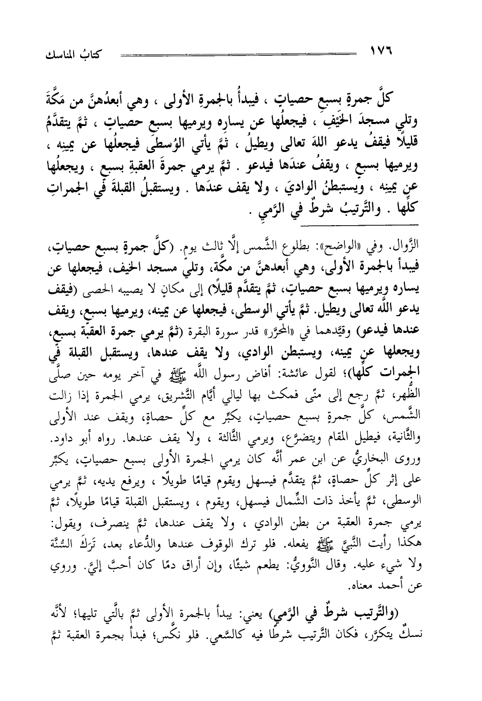 "والترتيب شرط في الرمي" يعني: يبدأ بالجمرة الأولى ثم بالتي تليها لأنه نسك يتكرر فكان الترتيب شرطا فيه كالسعي فلو نكس فبدأ بجمرة العقبة ثم