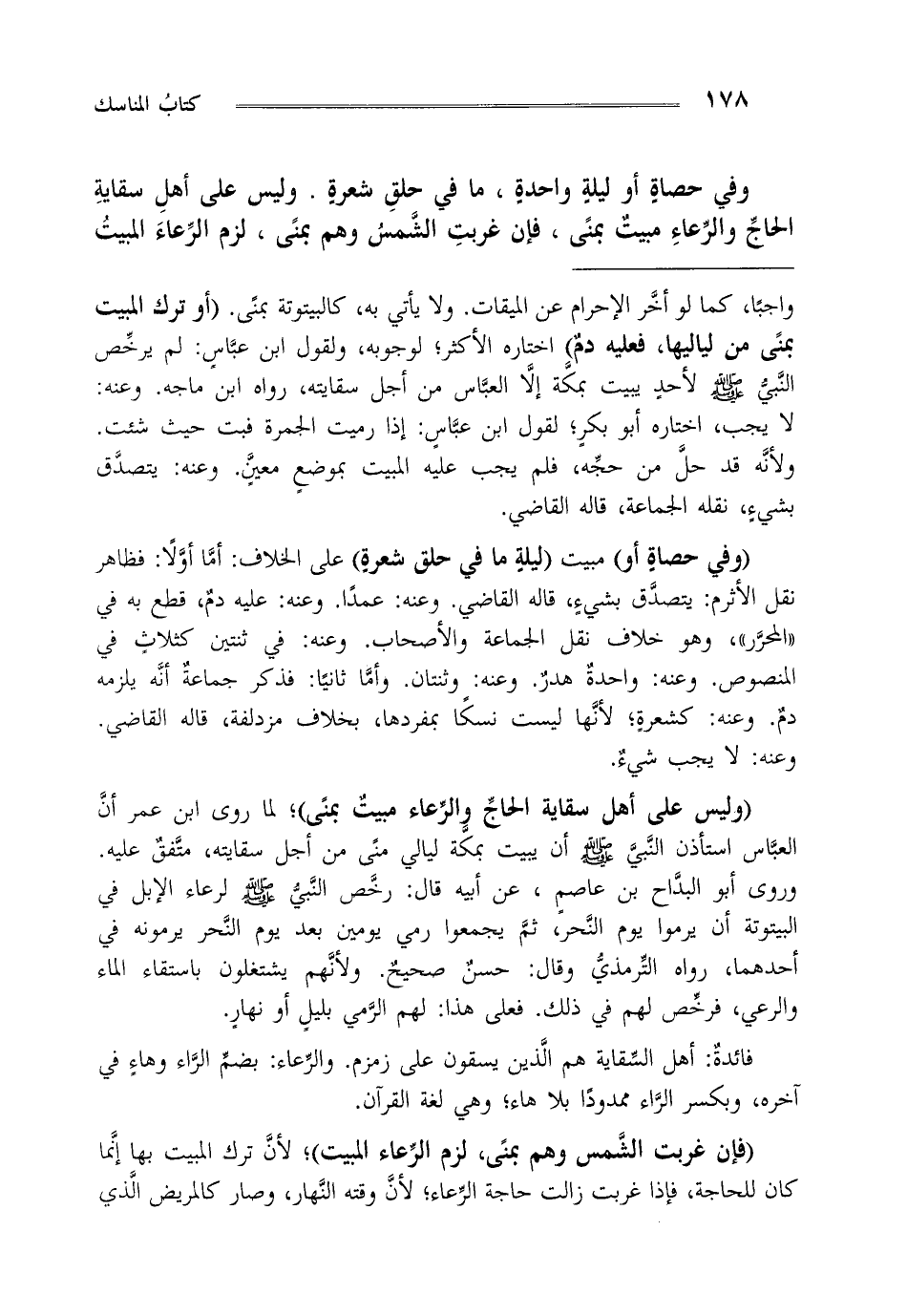 وفي حصاة أو ليلة واحدة ما في حلق شعرة وليس على أهل سقاية الحاج والرعاء مبيت بمنى فإن غربت الشمس وهم بمنى لزم الرعاء المبيت