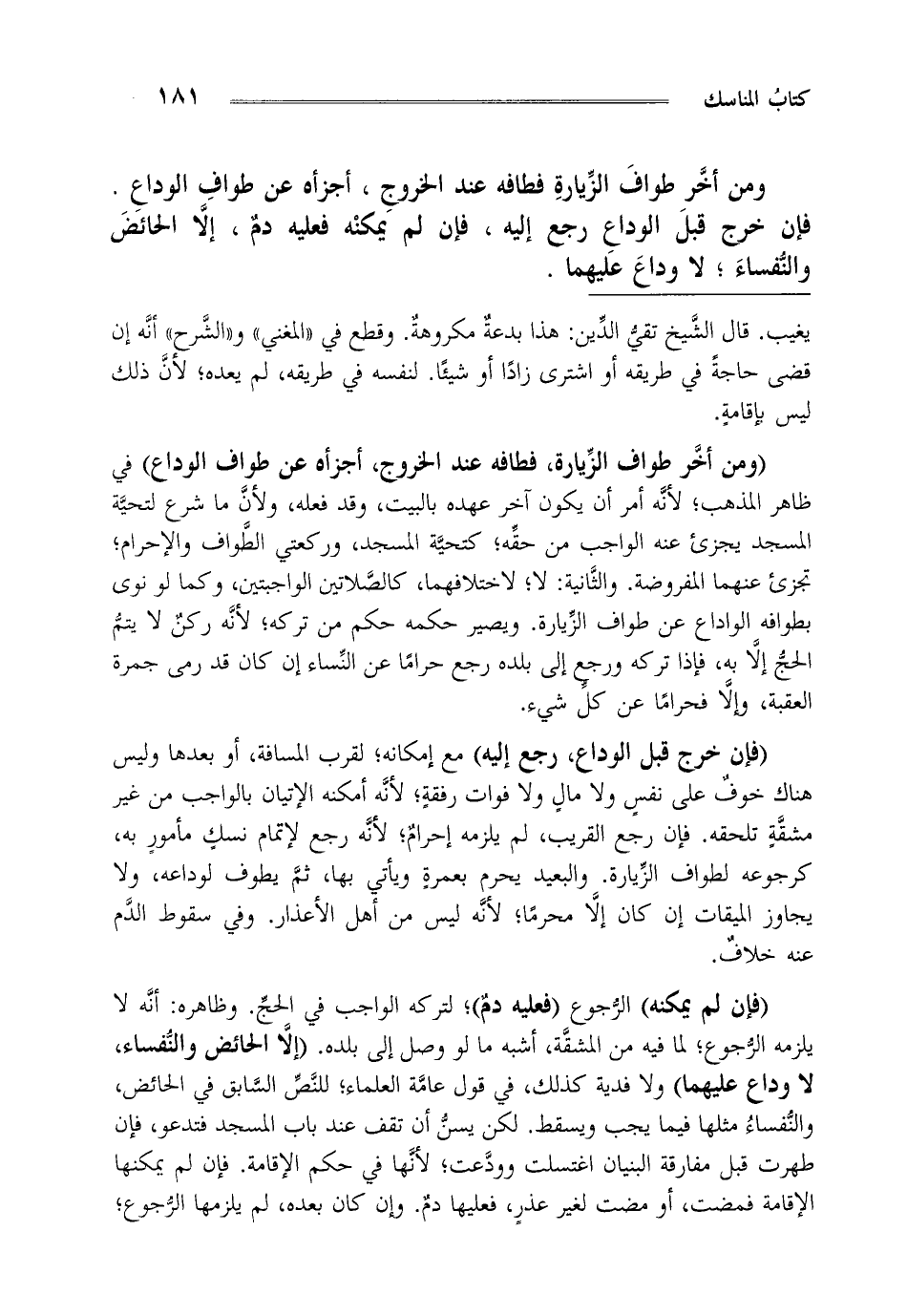 "فإن لم يمكنه" الرجوع "فعليه دم" لتركه الواجب في الحج وظاهره أنه لا يلزمه الرجوع لما فيه من المشقة أشبه ما لو وصل إلى بلدة. "إلا الحائض والنفساء لا وداع عليهما" ولا فدية لذلك في قول عامة العلماء للنص السابق في الحائض والنفساء مثلها فيما يجب ويسقط لكن يسن أن تقف عند باب المسجد فتدعو فإن طهرت قبل مفارقة البنيان اغتسلت وودعت لأنها في حكم الإقامة فإن لم يمكنها الإقامة فمضت أو مضت لغير عذر فعليها دم وإن كان بعده لم يلزمها الرجوع