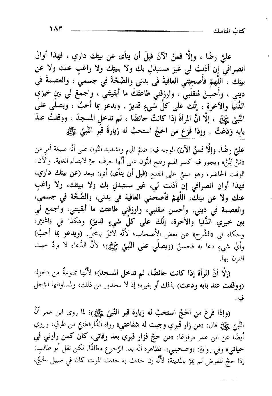 علي رضى وإلا فمن الآن قبل أن ينأى عن بيتك داري فهذا أوان انصرافي إن أذنت مستبدل بك ولا ببيتك ولا راغب عنك ولا عن بيتك اللهم فاصحبني العافية في بدني والصحة في جسمي والعصمة في ديني وأحسن منقلبي وارزقني طاعتك ما أبقيتني وأجمع لي بين خيري الدنيا والآخرة إنك على كل شيء قدير ويدعو بما على النبي صلى الله عليه وسلم إلا أن المرأة إذا كانت حائضا لم تدخل المسجد ووقفت عند بابه ودعت وإذا فرغ من الحج استحب له زيارة قبر النبي صلى الله عليه وسلم