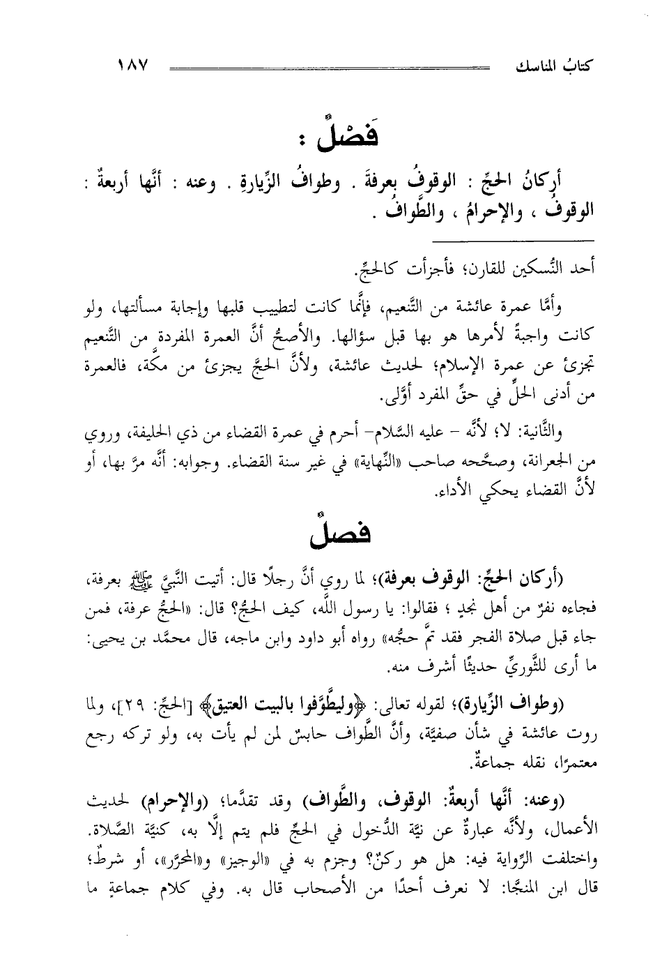 "أركان الحج: الوقوف بعرفة" لما روي أن رجلا قال أتيت النبي صلى الله عليه وسلم بعرفة فجاءه نفر من أهل نجد فقالوا يا رسول الله كيف الحج قال: "الحج عرفة فمن جاء قبل صلاة الفجر فقد تم حجه" رواه أبو داود وابن ماجه قال محمد بن يحيى ما أرى للثوري حديثا أشرف منه.