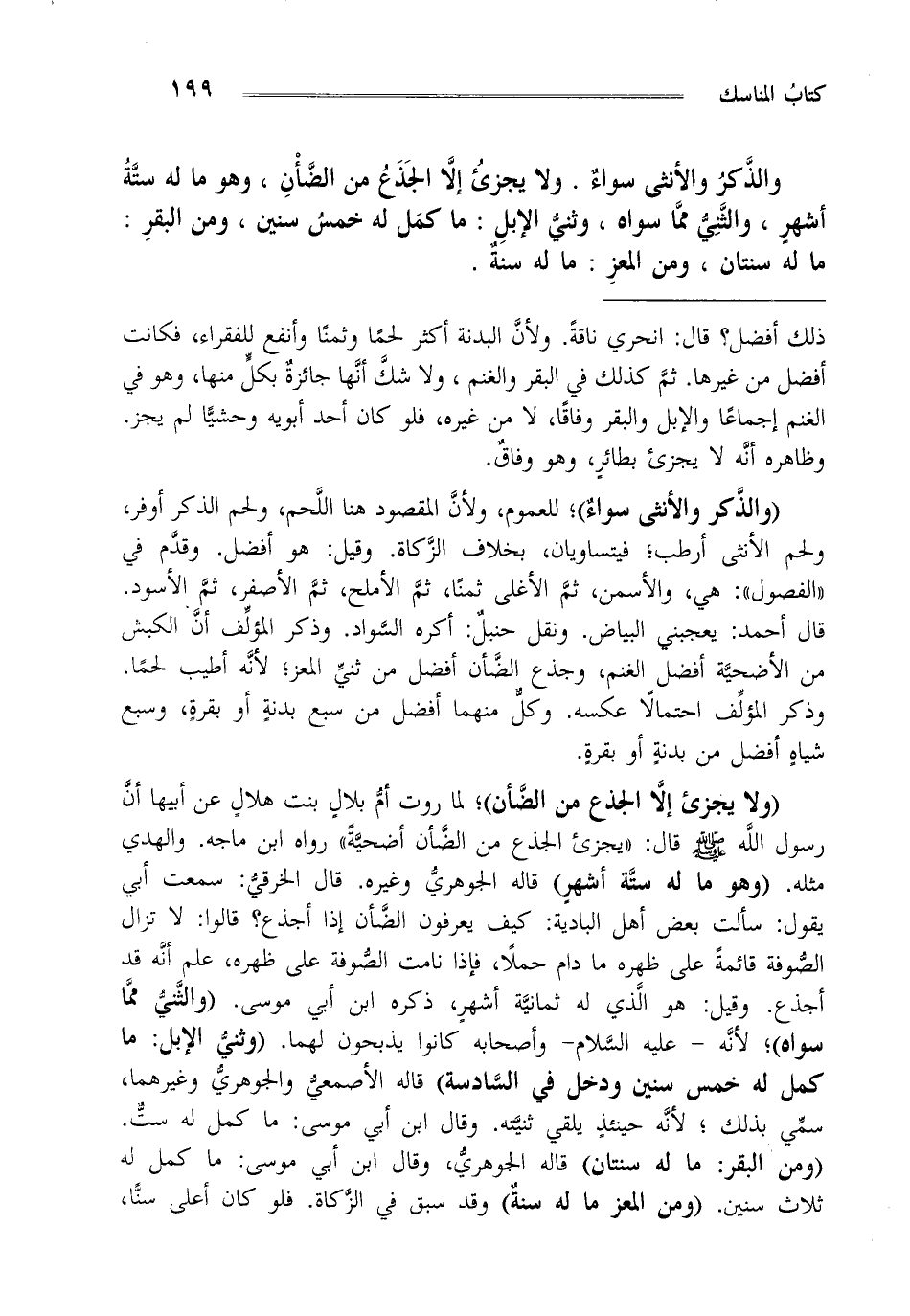 "ولا يجزئ إلا الجذع من الضأن" لما روت أم بلال بنت هلال عن أبيها أن رسول الله صلى الله عليه قال: "يجزئ الجذع من الضأن أضحية" رواه ابن ماجه والهدي مثله. "وهو ماله ستة أشهر" قاله الجوهري وغيره قال الخرقي سمعت أبي يقول سألت بعض أهل البادية كيف يعرفون الضأن إذا أجذع قالوا لا تزال الصوفة قائمة على ظهره ما دام حملا فإذا نامت الصوفة على ظهره علم أنه قد أجذع وقيل هو الذي له ثمانية أشهر ذكره ابن أبي موسى. "والثني مما سواه" لأنه عليه السلام وأصحابه كانوا يذبحون لهما. "وثني الإبل: ما كمل له خمس سنين ودخل في السادسة" قاله الأصمعي والجوهري وغيرهما سمي بذلك لأنه حينئذ يلقي ثنيته وقال ابن أبي موسى ما كمل له ست "ومن البقر: ما له سنتان" قاله الجوهري وقال ابن أبي موسى ما كمل له ثلاث سنين. "ومن المعز ما له سنة" وقد سبق في الزكاة فلو كان أعلى سنا