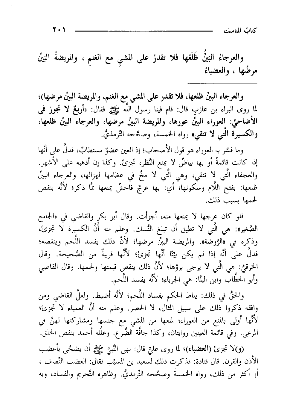 فلو كان عرجها لا يمنعها منه أجزأت وقال أبو بكر والقاضي في "الجامع الصغير": هي التي لا تطيق أن تبلغ النسك وعلم منه أن الكسيرة لا تجزئ وذكره في "الروضة". والمريضة البين مرضها لأن ذلك يفسد اللحم وينقصه فدل على أنه إذا لم يكن بينا أنها تجزئ لأنها قريبة من الصحيحة وقال الخرقي هي التي لا يرجى برؤها لأن ذلك ينقص قيمتها ولحمها وقال القاضي و أبو الخطاب وابن البنا هي الجرباء لأنه يفسد اللحم.