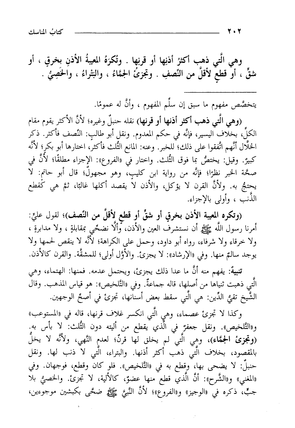 "وتكره المعيبة الأذن بخرق أو شق أو قطع لأقل من النصف" لقول علي أمرنا رسول الله صلى الله عليه وسلم أن نستشرف العين والأذن وأن لا نضحي بمقابلة ولا مدابرة ولا خرقاء ولا شرفاء رواه أبو داود وحمل على الكراهة لأنه لا ينقص لحمها ولا يوجد سالم منها وفي "الإرشاد": لا يجزئ والأول أولى للمشقة والقرن كالأذن.