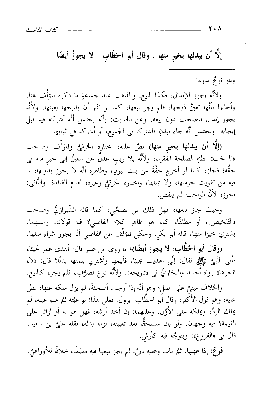 "إلا أن يبدلها بخير منها" نص عليه اختاره الخرقي والمؤلف وصاحب "المنتخب" نظرا لمصلحة الفقراء ولأنه بلا ريب عدل عن المعين إلى خير منه في حقه فجاز كما لو أخرج حقة عن بنت لبون وظاهره أنه لا يجوز بدونها لما فيه من تفويت حرمتها ولا بمثلها واختاره الخرقي وغيره لعدم الفائدة والثاني يجوز لأن الواجب لم ينقص.