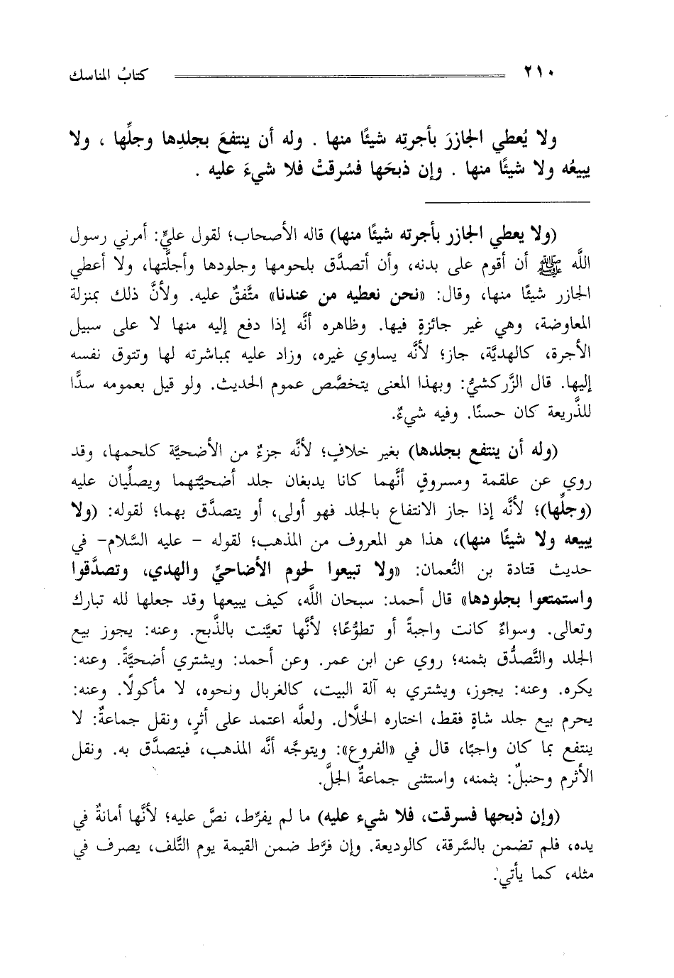 ولا يعطي الجازر بأجرته شيئا منها وله أن ينتفع بجلدها وجلها ولا يبيعه ولا شيئا منها وإن ذبحها فسرقت فلا شيء عليه
