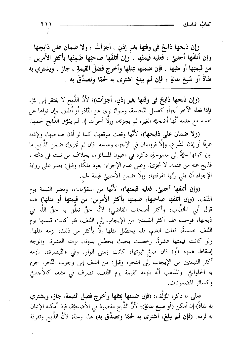 "وإن أتلفها أجنبي، فعليه قيمتها"، لأنها من المتقومات وتعتبر القيمة يوم التلف. "وإن أتلفها صاحبها ضمنها بأكثر الأمرين من قيمتها أو مثلها" هذا قول أبي الخطاب وأكثر أصحاب القاضي لأنه حق تعلق به حق الله في ذبحها فوجب عليه أكثر القيمتين من الإيجاب إلى التلف فلو كانت قيمتها يوم التلف خمسة فغلت الغنم فلم يحصل مثلها إلا بأكثر من ذلك لزمه مثلها ولو كانت قيمتها عشرة رخصت بحيث يحصل بدونه لزمته العشرة والوجه إسقاط همزة "أو" فإن صح ثبوتها كانت بمعنى الواو وفي "التبصرة": يلزمه أكثر القيمتين من الإيجاب إلى النحر وقيل من التلف إلى وجوب النحر جزم به الحلواني والمذهب أنه يلزمه القيمة يوم التلف تصرف في مثله كالأجنبي وكسائر المضمونات.