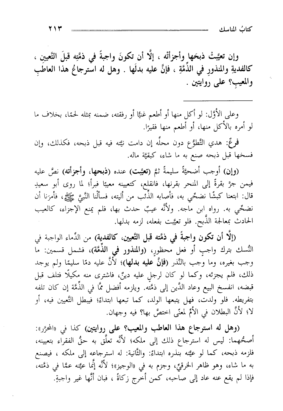 وإن تعيبت ذبحها وأجزأته إلا أن تكون واجبة في ذمته قبل التعيين كالفدية والمنذور في الذمة فإن عليه بدلها و هل له استرجاع هذا العاطب والمعيب على روايتين.