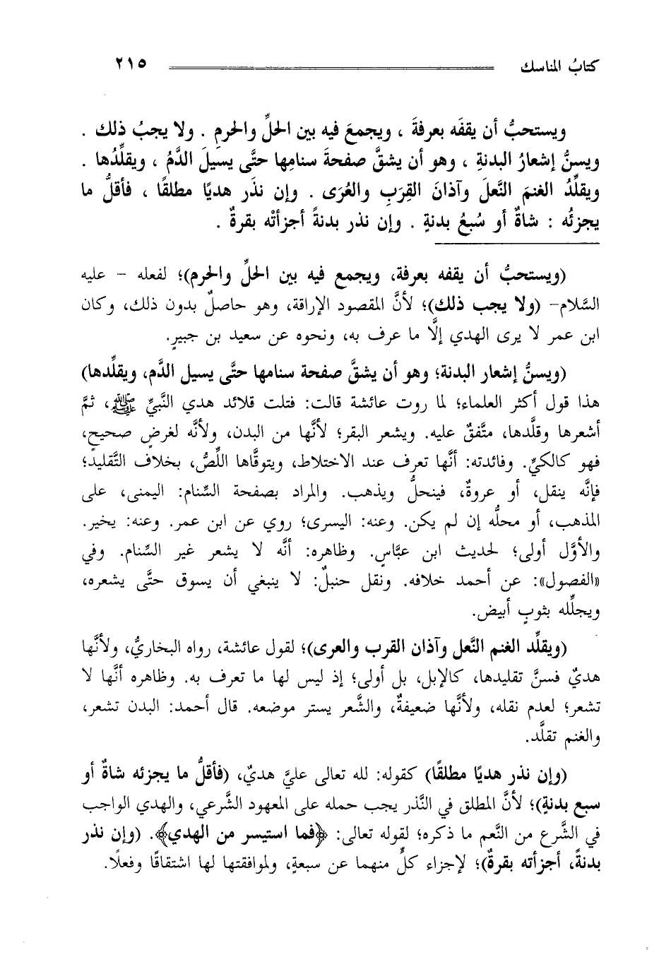 ويستحب أن يقفه بعرفة ويجمع فيه بين الحل والحرم ولا يجب ذلك ويسن إشعار البدنة وهو أن يشق صفحة سنامها حتى يسيل الدم ويقلدها أو يقلد الغنم النعل وآذان القرب والعرى وإن نذر هديا مطلقا فأقل ما يجزئه شاة أو سبع بدنة وإن نذر بدنة أجزأته بقرة