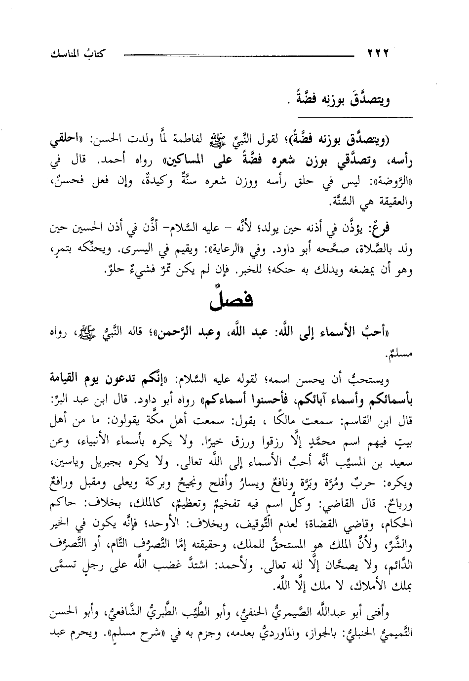 ويستحب أن يحسن اسمه لقوله عليه السلام: " إنكم تدعون يوم القيامة بأسمائكم وأسماء آبائكم، فأحسنوا أسماءكم" رواه أبو داود. قال ابن عبد البر قال ابن القاسم: سمعت مالكا، يقول: سمعت أهل مكة يقولون ما من أهل بيت فيهم اسم محمد إلا رزقوا ورزق خيرا ولا يكره بأسماء الأنبياء وعن سعيد بن المسبب أنه أحب الأسماء إلى الله تعالى ولا يكره بجبريل وياسين ويكره حرب ومرة وبرة ونافع ويسار وأفلح ونجيح وبركة ويعلى ومقبل ورافع ورباح قال القاضي وكل اسم فيه تفخيم وتعظيم كالملك بخلاف حاكم الحكام وقاضي القضاة لعدم التوقيف وبخلاف الأوحد فإنه يكون في الخير والشر ولأن الملك هو المستحق للملك وحقيقته إما التصرف التام أو التصرف الدائم ولا يصحان إلا لله تعالى ولأحمد اشتد غضب الله على رجل تسمى بملك الأملاك لا ملك إلا الله.