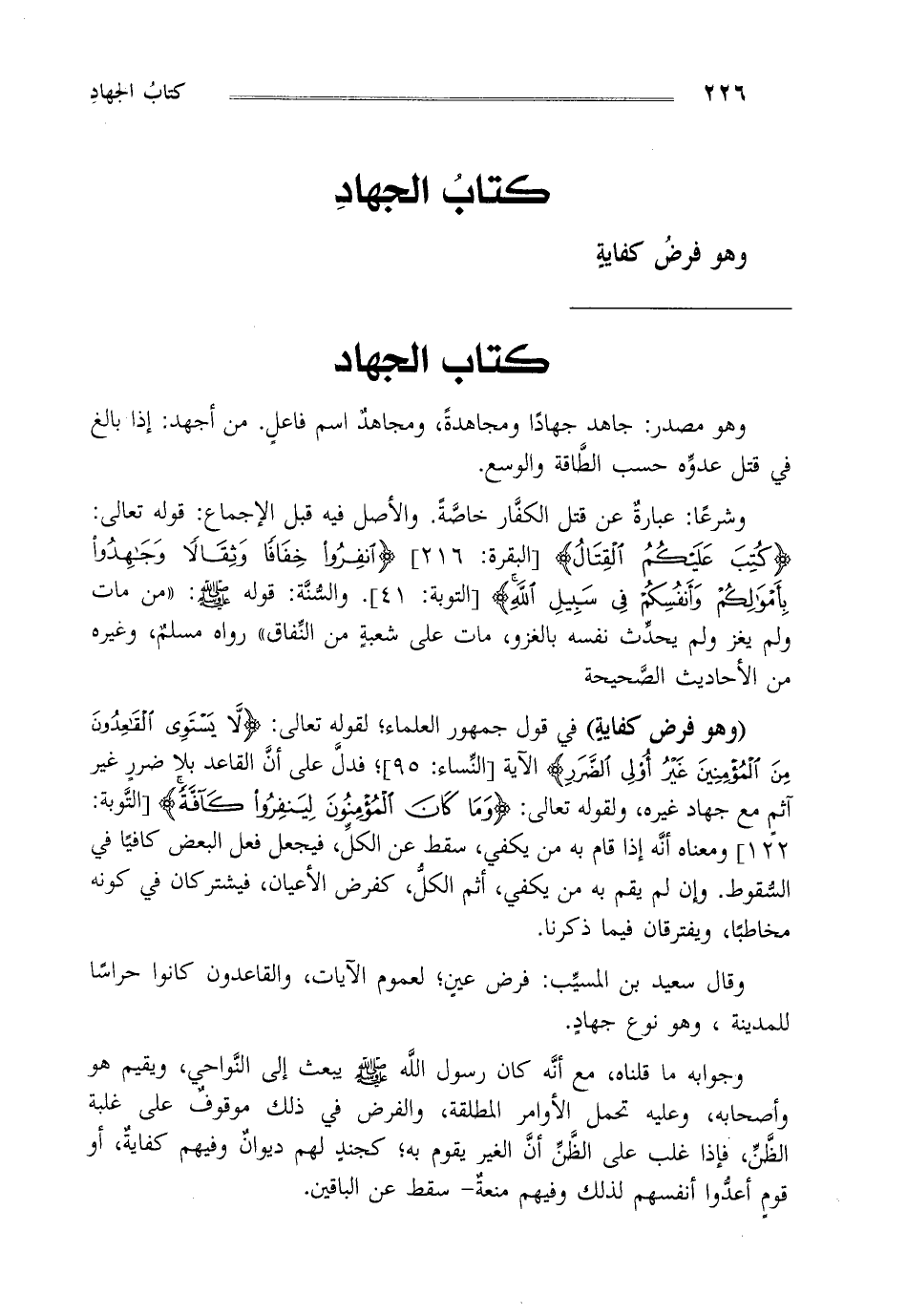 وشرعا: عبارة عن قتل الكفار خاصة والأصل فيه قبل الإجماع قوله تعالى: {كُتِبَ عَلَيْكُمُ الْقِتَالُ} [البقرة: 216] {انْفِرُوا خِفَافاً وَثِقَالاً وَجَاهِدُوا بِأَمْوَالِكُمْ وَأَنْفُسِكُمْ فِي سَبِيلِ اللَّهِ} [التوبة: 41]. والسنة: قوله صلى الله عليه وسلم: "من مات ولم يغز ولم يحدث نفسه بالغزو مات على شعبة من النفاق " رواه مسلم، وغيره من الأحاديث الصحيحة.