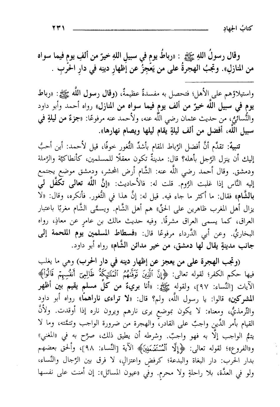 وقال رسول الله صلى الله عليه وسلم: "رباط يوم في سبيل الله خير من ألف يوم فيما سواه من المنازل". وتجب الهجرة على من يعجز عن إظهار دينه في دار الحرب.