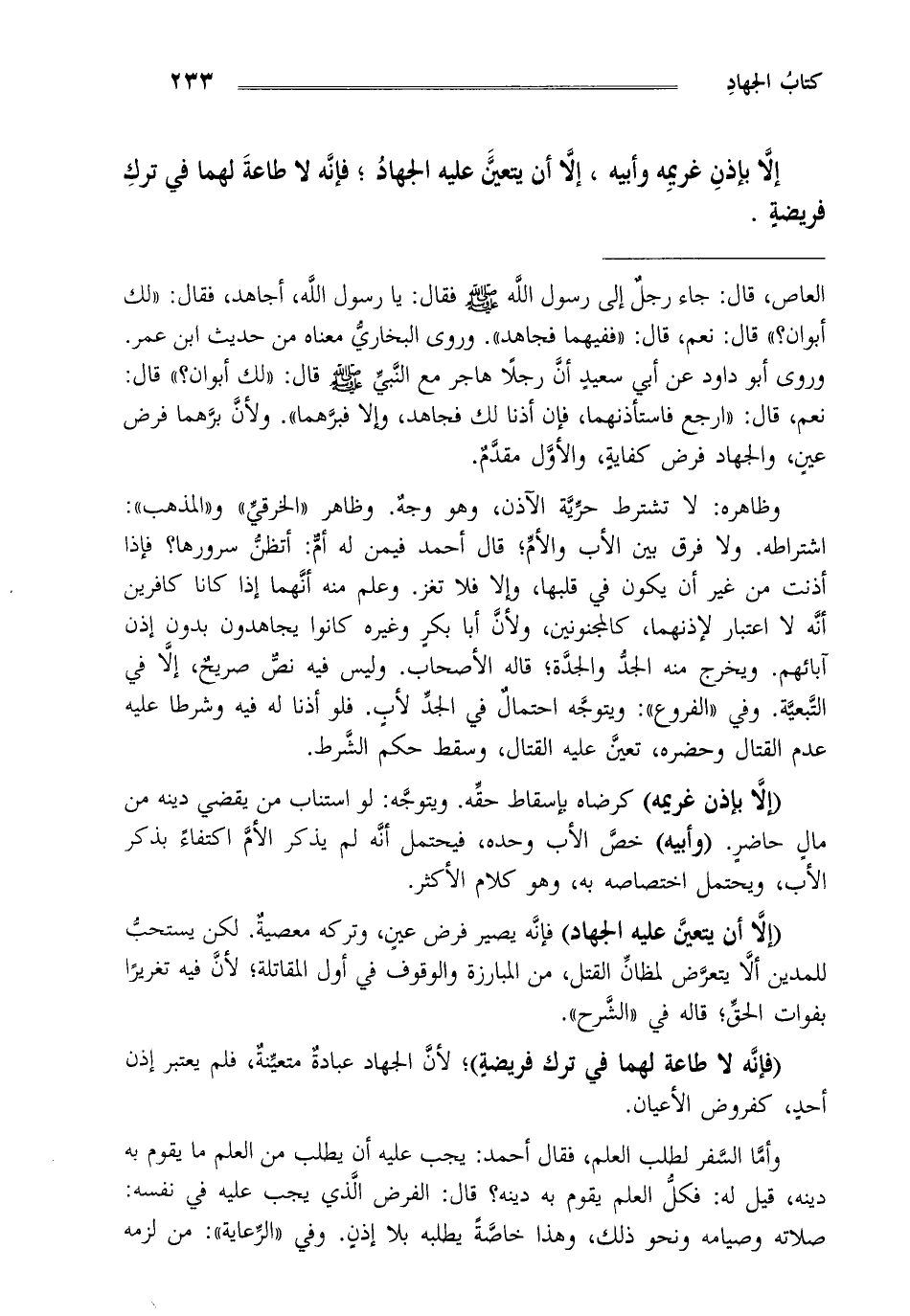 العاص قال جاء رجل إلى رسول الله صلى الله عليه وسلم فقال يا رسول الله أجاهد فقال: "لك أبوان؟" قال نعم قال: "ففيهما فجاهد". وروى البخاري معناه من حديث ابن عمر وروى أبو داود عن أبي سعيد أن رجلا هاجر مع النبي صلى الله عليه وسلم قال: "لك أبوان؟" قال نعم قال: "ارجع فاستأذنهما، فإن أذنا لك فجاهد وإلا فبرهما". ولأن برهما فرض عين والجهاد فرض كفاية والأول مقدم.