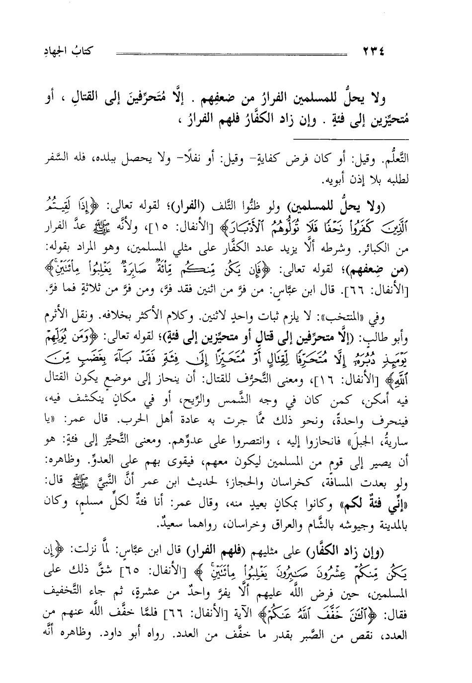 "ولا يحل للمسلمين" ولو ظنوا التلف "الفرار"، لقوله تعالى: {إِذَا لَقِيتُمُ الَّذِينَ كَفَرُوا زَحْفاً فَلا تُوَلُّوهُمُ الْأَدْبَارَ} [الأنفال: 15]، ولأنه صلى الله عليه وسلم عد الفرار من الكبائر وشرطه أن لا يزيد عدد الكفار على مثلي المسلمين وهو المراد بقوله: "من ضعفهم"، لقوله تعالى: {فَإِنْ يَكُنْ مِنْكُمْ مِائَةٌ صَابِرَةٌ يَغْلِبُوا مِائَتَيْنِ} [الأنفال: 66]. قال ابن عباس: من فر من اثنين فقد فر ومن فر من ثلاثة فما فر.