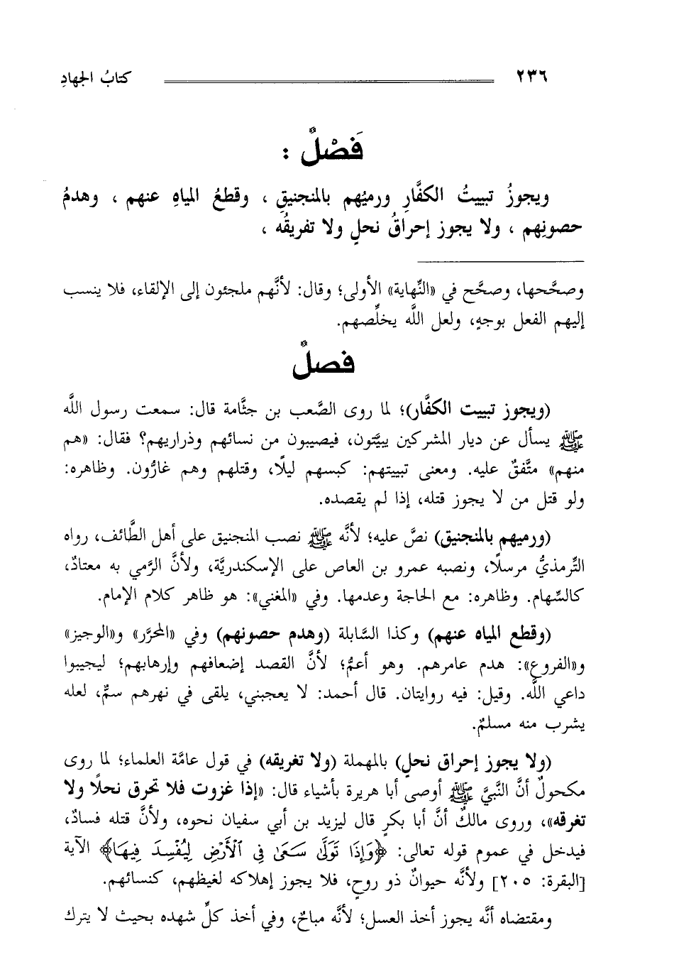 ويجوز تبييت الكفار ورميهم بالمنجنيق وقطع المياه عنهم وهدم حصونهم ولا يجوز إحراق نحل ولا تفريقه،