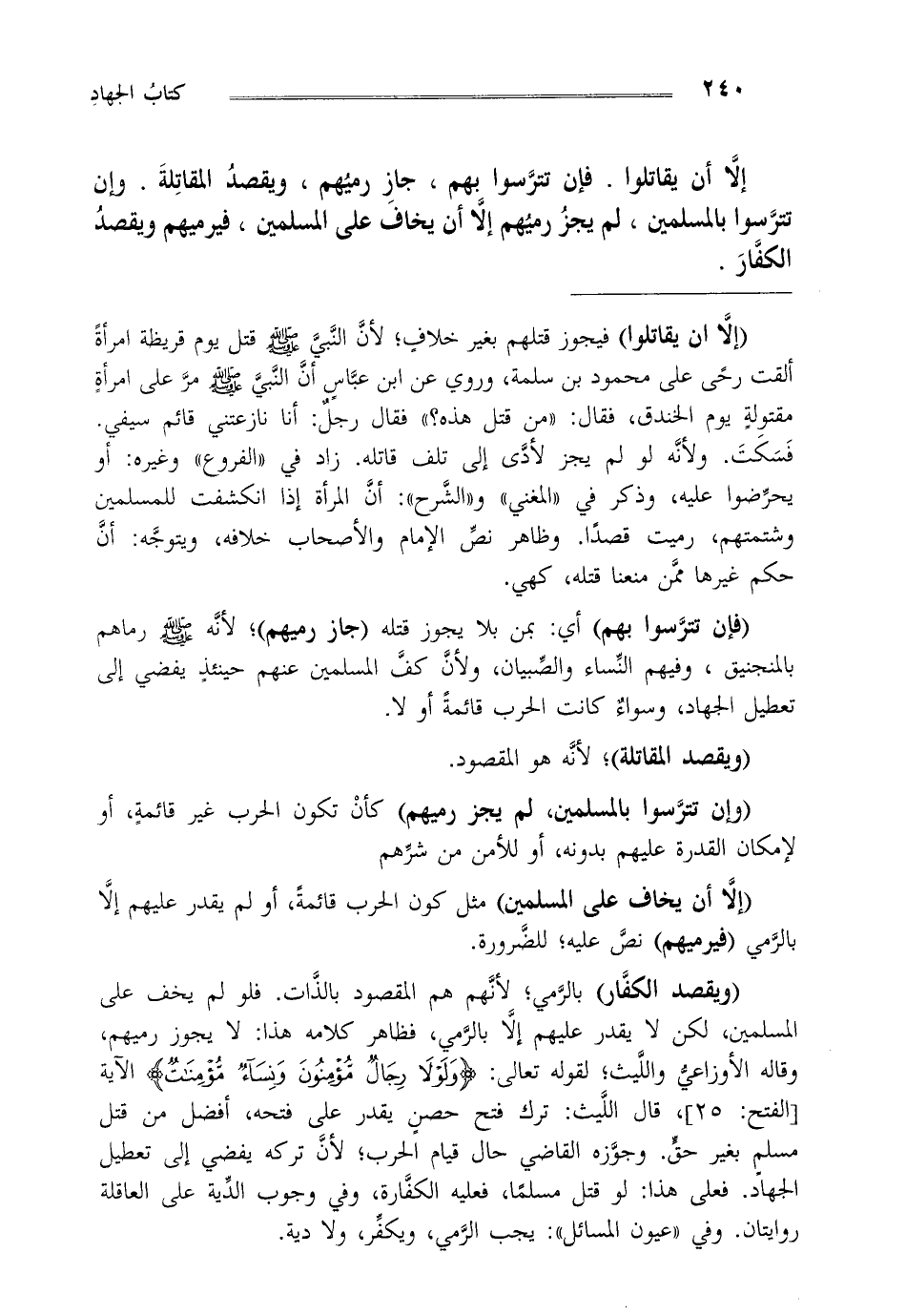 "وإن تترسوا بالمسلمين لم يجز رميهم" كأن تكون قائمة أو لإمكان القدرة عليهم بدونه أو للأمن من شرهم.