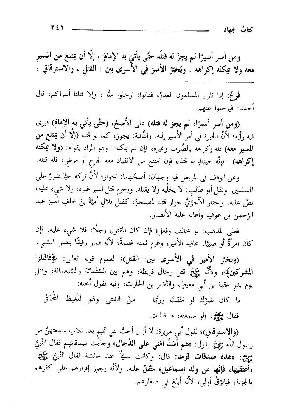 "ومن أسر أسيرا لم يجز له قتله" على الأصح، "حتى يأت به الإمام" فيرى فيه رأيه لأن الخيرة في أمر الأسير إليه والثانية يجوز كما لو قتله "إلا أن يمتنع من المسير معه" فله إكراهه بالضرب وغيره فإن لم يمكنه وهو المراد بقوله: "ولا يمكنه إكراهه" فإنه حينئذ له قتله فإن امتنع من الانقياد معه لجرح أو مرض فله قتله.