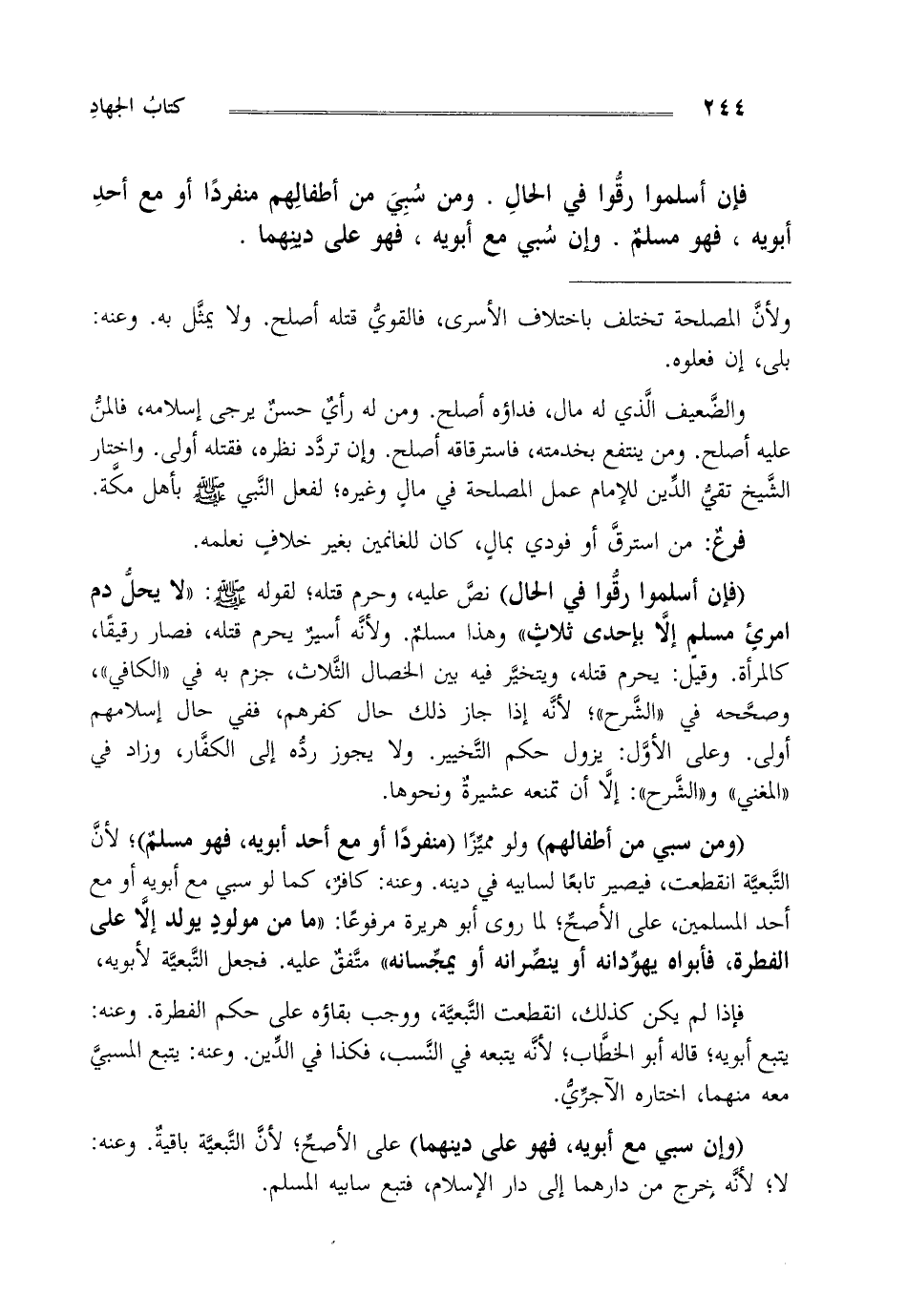 "ومن سبي من أطفالهم" ولو مميزا "منفردا أو مع أحد أبويه فهو مسلم"، لأن التبعية انقطعت فيصير تابعا لسابيه في دينه وعنه كافر كما لو سبي مع أبويه أو مع أحد المسلمين على الأصح لما روى أبو هريرة مرفوعا: "ما من مولود يولد إلى على الفطرة فأبواه يهودانه أو ينصرانه أو يمجسانه" متفق عليه. فجعل التبعية لأبويه،