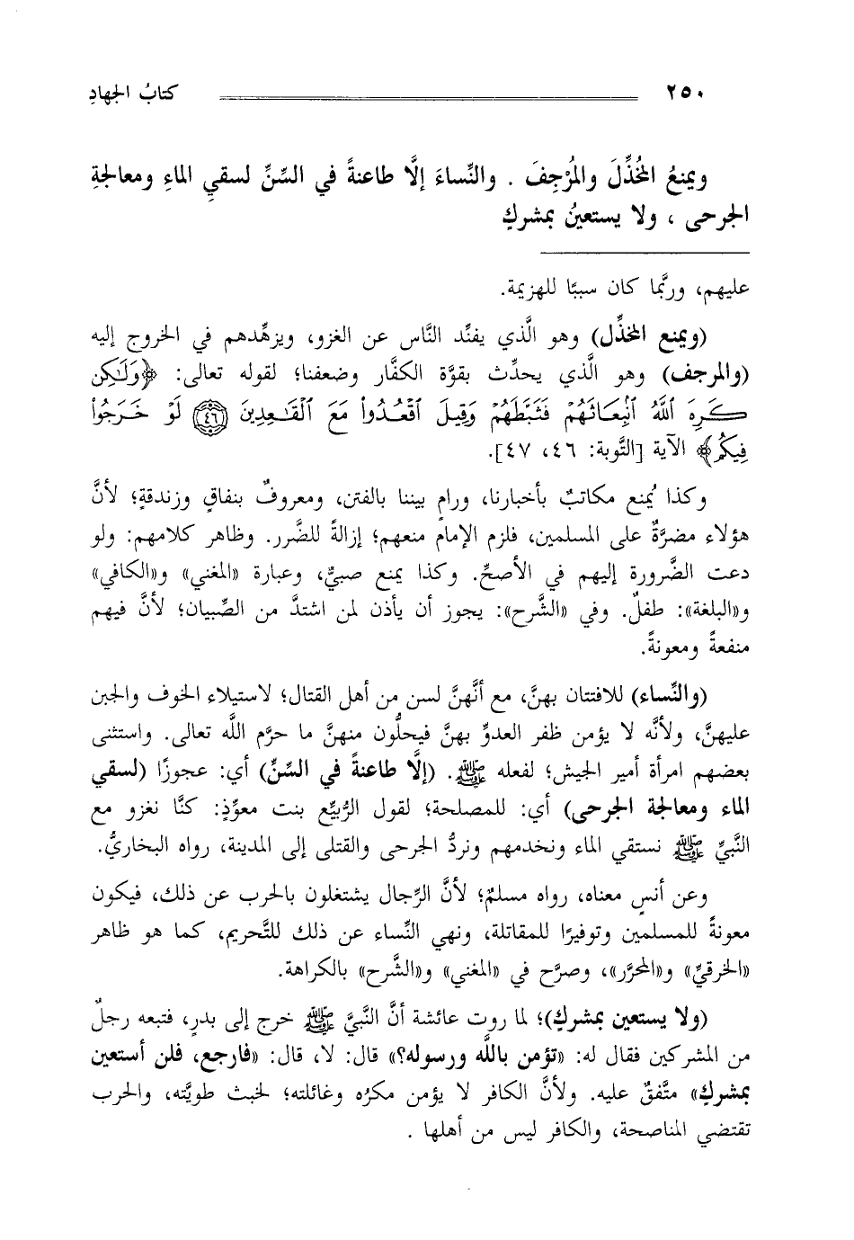 ويمنع المخذل والمرجف والنساء إلا طاعنة في السن لسقي الماء ومعالجة الجرحى ولا يستعين بمشرك.