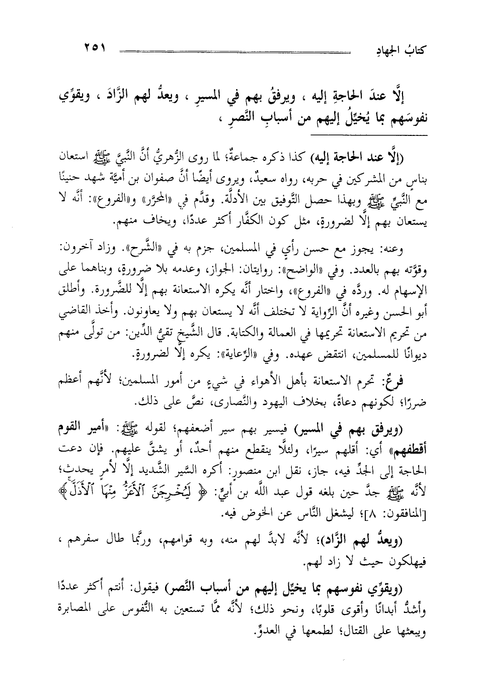 "إلا عند الحاجة إليه" كذا ذكره جماعة لما روى الزهري أن النبي صلى الله عليه وسلم استعان بناس من المشركين في حربه رواه سعيد ويروى أيضا أن صفوان بن أمية شهد حنينا مع النبي صلى الله عليه وسلم وبهذا حصل التوفيق بين الأدلة وقدم في "المحرر" و"الفروع": أنه لا يستعان بهم إلا لضرورة مثل كون الكفار أكثر عددا ويخاف منهم.