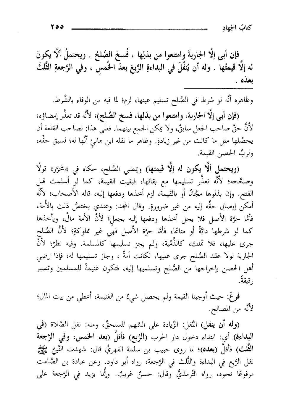 "فإن أبى إلا الجارية وامتنعوا من بذلها، فسخ الصلح"، لأنه قد تعذر إمضاؤه لأن حق صاحب الجعل سابق ولا يمكن الجمع بينهما فعلى هذا لصاحب القلعة أن يحصلها مثل ما كانت من غير زيادة وظاهر ما نقله ابن هانئ أنها له لسبق حقه ولرب الحصن القيمة.