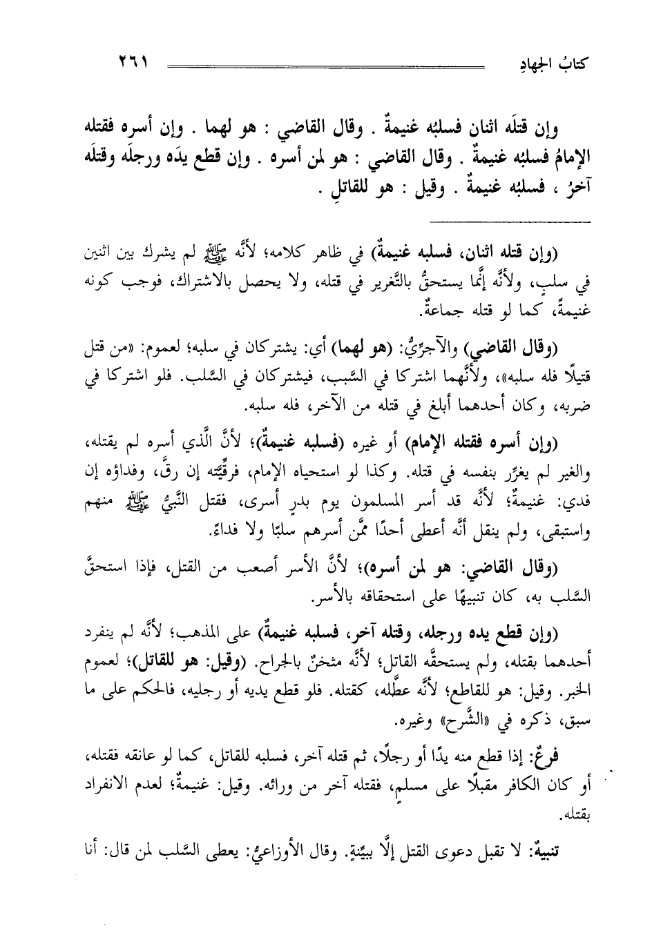 تنبيه: لا تقبل دعوى القتل إلا ببينة وقال الأوزاعي يعطى السلب لمن قال أنا