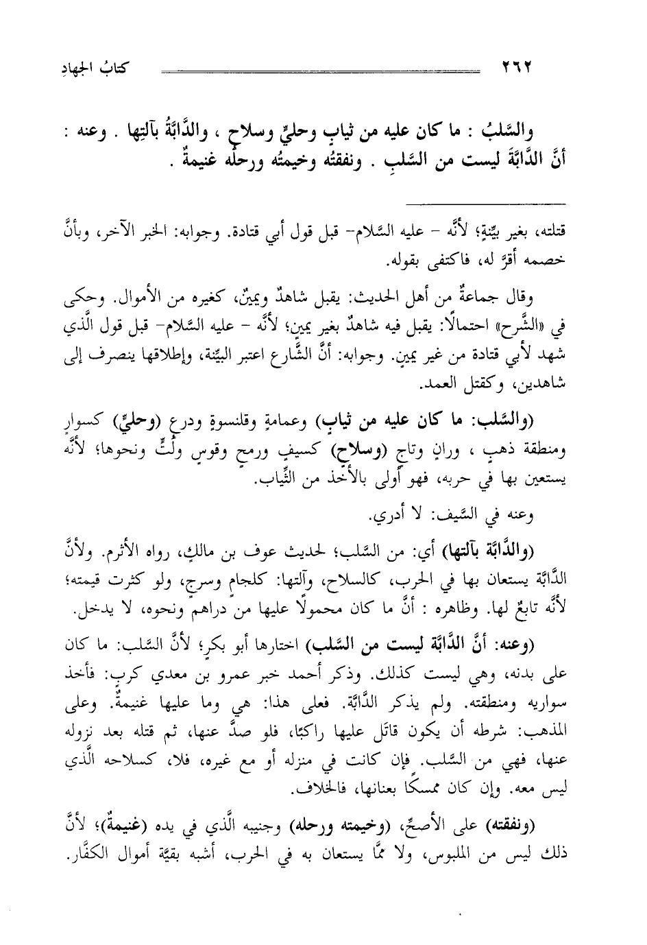 والسلب: ما كان عليه من ثياب وحلي وسلاح والدابة بآلتها وعنه أن الدابة ليست من السلب ونفقته وخيمته ورحله غنيمة.