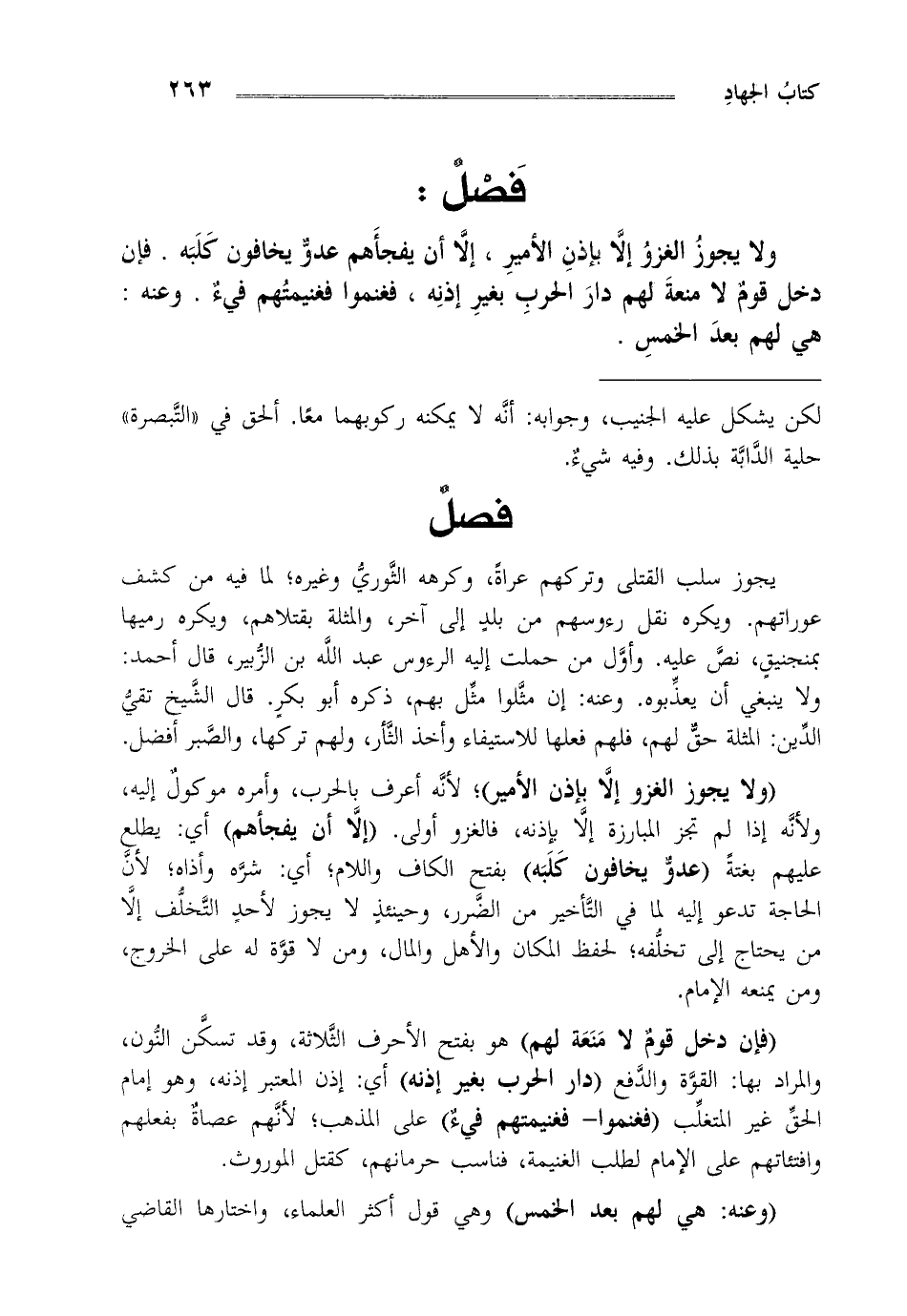 "ولا يجوز الغزو إلا بإذن الأمير"، لأنه أعرف بالحرب وأمره موكول إليه ولأنه إذا لم تجز المبارزة إلا بإذنه فالغزو أولى. "إلا أن يفجأهم" أي يطلع عليهم بغتة "عدو يخافون كلبه" بفتح الكاف واللام أي شره وأذاه لأن الحاجة تدعو إليه لما في التأخير من الضرر وحينئذ لا يجوز التخلف إلا من يحتاج إلى تخلفه لحفظ المكان والأهل والمال ومن لا قوة له على الخروج ومن يمنعه الإمام.