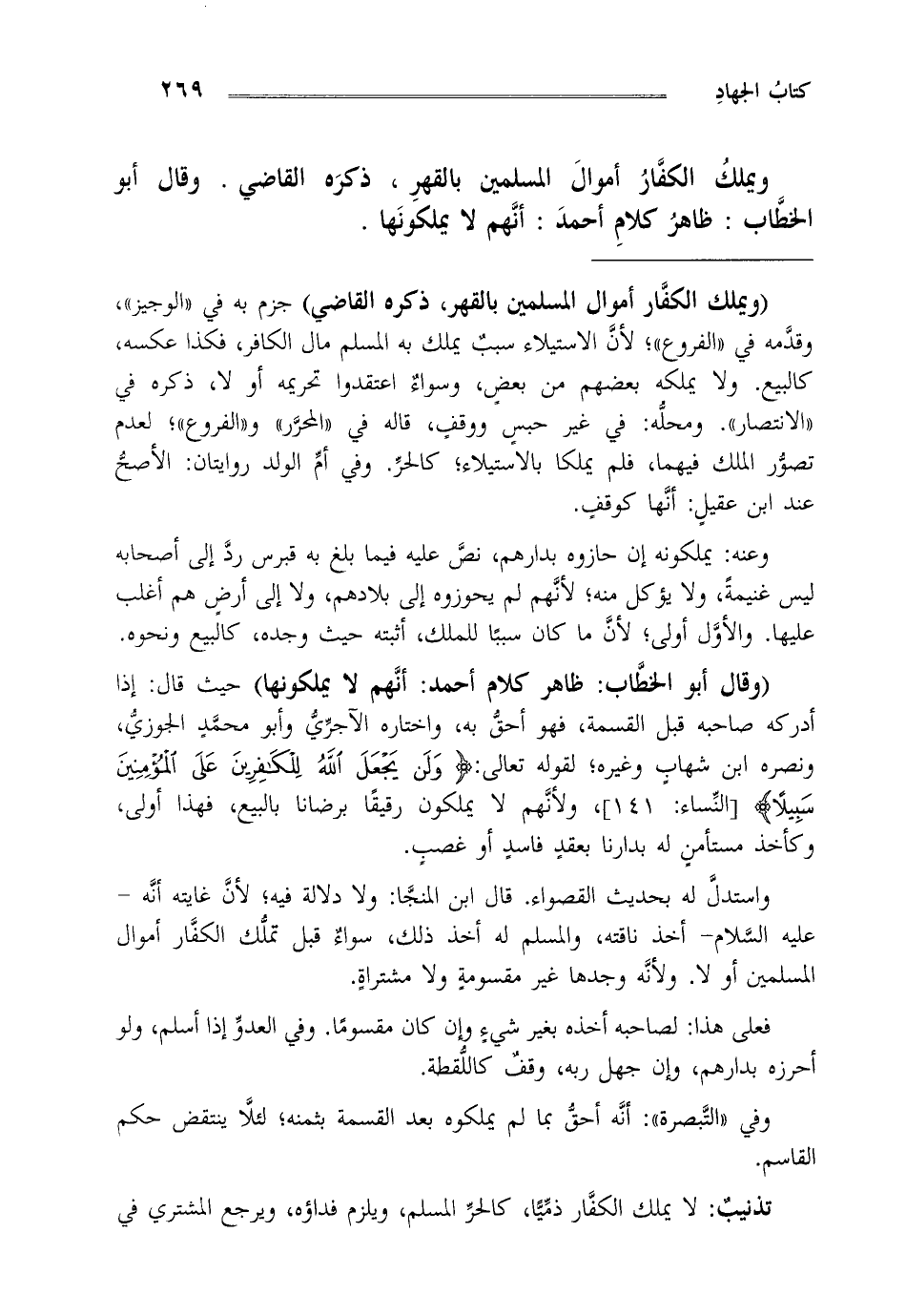 "وقال أبو الخطاب ظاهر كلام أحمد أنهم لا يملكونها" حيث قال إذا أدركه صاحبه قبل القسمة فهو أحق به واختاره الآجري و أبو محمد الجوزي ونصره ابن شهاب وغيره، لقوله تعالى: {وَلَنْ يَجْعَلَ اللَّهُ لِلْكَافِرِينَ عَلَى الْمُؤْمِنِينَ سَبِيلاً} [النساء: 141] ولأنهم لا يملكون رقيقا برضانا بالبيع فهذا أولى وكأخذ مستأمن له بدارنا بعقد فاسد أو غصب.