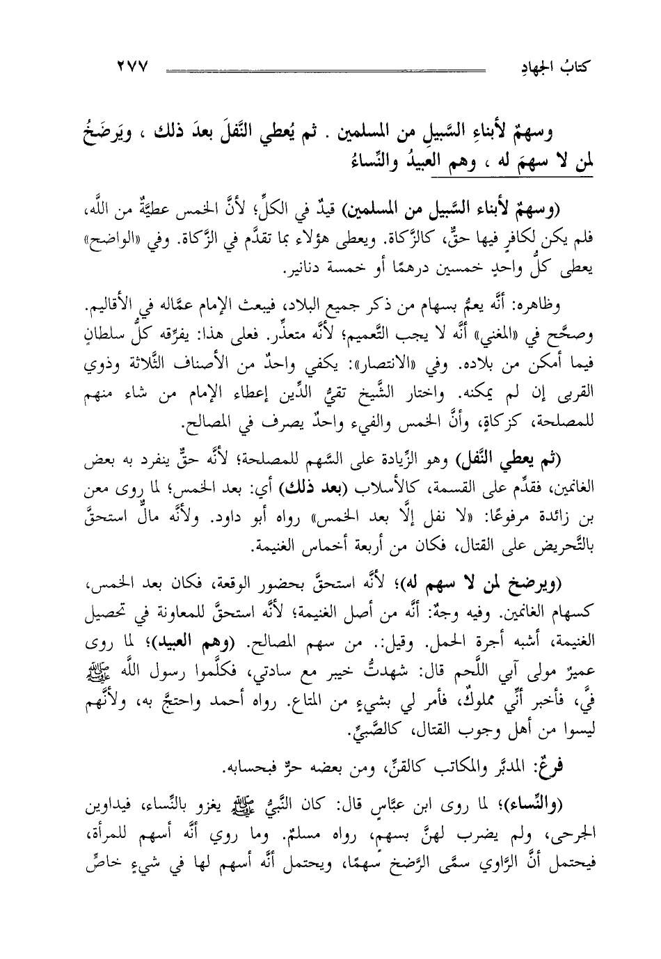 "والنساء"، لما روى ابن عباس قال كان النبي صلى الله عليه وسلم يغزو بالنساء فيداوين الجرحى ولم يضرب لهن بسهم رواه مسلم وما روي أنه أسهم للمرأة فيحتمل أن الراوي سمى الرضخ سهما ويحتمل أنه أسهم لها في شيء خاص