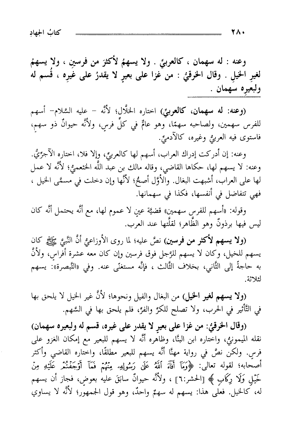 "وقال الخرقي من غزا على بعير لا يقدر على غيره قسم له ولبعيره سهمان" نقله الميموني واختاره ابن البنا وظاهره أنه لا يسهم للبعير مع إمكان الغزو على فرس ولكن نص في رواية مهنا أنه يسهم للبعير مطلقا واختاره القاضي وأكثر أصحابه لقوله تعالى: {وَمَا أَفَاءَ اللَّهُ عَلَى رَسُولِهِ مِنْهُمْ فَمَا أَوْجَفْتُمْ عَلَيْهِ مِنْ خَيْلٍ وَلا رِكَابٍ} [الحشر: 6]، ولأنه حيوان سابق عليه بعوض فجاز أن يسهم له كالخيل فعلى هذا يسهم له سهم واحد وهو قول الجمهور لأنه لا يساوي