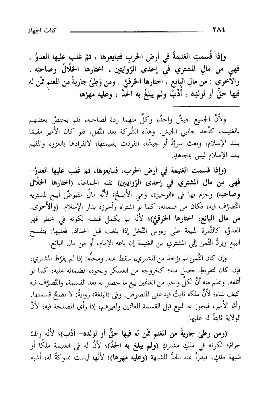 "وإذا قسمت الغنيمة في أرض الحرب فتبايعوها ثم غلب عليها العدو فهي من مال المشتري في إحدى الروايتين" نقله الجماعة "اختارها الخلال وصاحبه" وجزم بها في "الوجيز"، وهي الأصح لأنه مال مقبوض أبيح لمشتريه التصرف فيه فكان من ضمانه كما لو اشتراه وأحرزه بدار الإسلام. "والأخرى من مال البائع اختارها الخرقي"، لأنه لم يكمل قبضه لكونه في خطر قهر العدو كالثمرة المبيعة على رؤوس النخل إذا بلغت قبل الجذاذ فعليها ينفسخ البيع ويرد الثمن إلى المشتري من الغنيمة إن باعه الإمام أو من مال البائع.