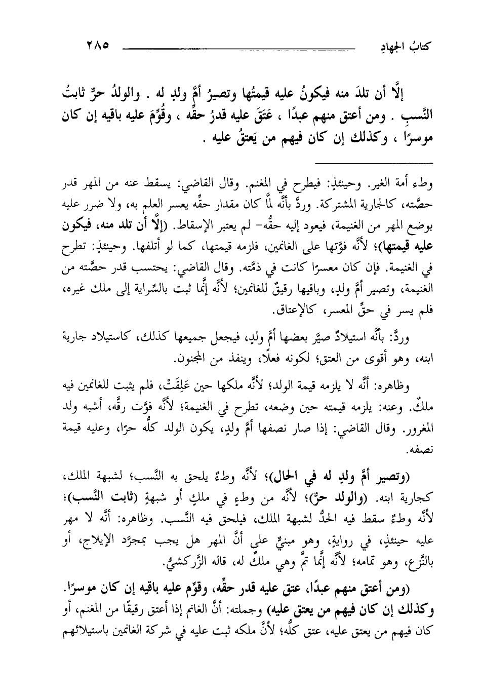 وطء أمة الغير وحينئذ فيطرح في المغنم وقال القاضي يسقط عنه من المهر قدر حصته كالجارية المشتركة ورد بأنه لما كان مقدار حقه يعسر العلم به ولا ضرر عليه بوضع المهر من الغنيمة فيعود إليه حقه لم يعتبر الإسقاط. "إلا أن تلد منه فيكون عليه قيمتها"، لأنه فوتها على الغانمين فلزمه قيمتها كما لو أتلفها وحينئذ تطرح في الغنيمة فإن كان معسرا كانت في ذمته وقال القاضي يحتسب قدر حصته من الغنيمة وتصير أم ولد وباقيها رقيق للغانمين لأنه إنما ثبت بالسراية إلى ملك غيره فلم يسر في حق المعسر كالإعتاق.