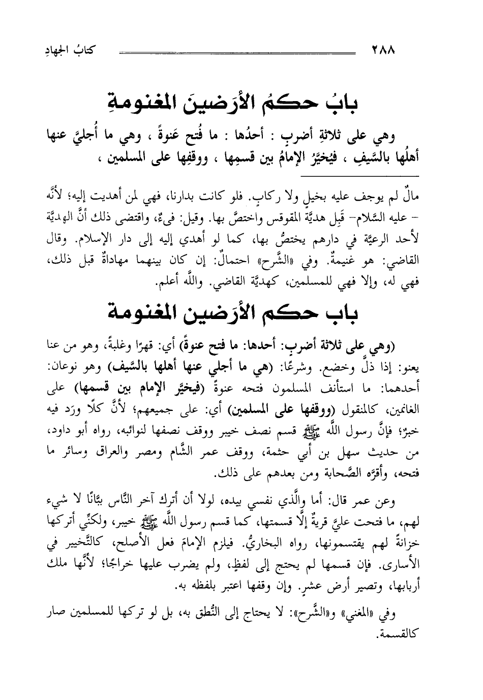 "وهي على ثلاثة أضرب: أحدها: ما فتح عنوة" أي: قهرا وغلبة وهو عنا يعنو إذا ذل وخضع وشرعا: "هي ما أجلي عنها أهلها بالسيف" وهو نوعان أحدهما ما استأنف المسلمون فتحه عنوة "فيخير الإمام بين قسمها" على الغانمين كالمنقول "ووقفها على المسلمين" أي: على جميعهم لأن كلا ورد فيه خبر فإن رسول الله صلى الله عليه وسلم قسم نصف خيبر ووقف نصفها لنوائبه رواه أبو داود من حديث سهل بن أبي حثمة ووقف عمر الشام ومصر والعراق وسائر ما فتحه وأقره الصحابة ومن بعدهم على ذلك.