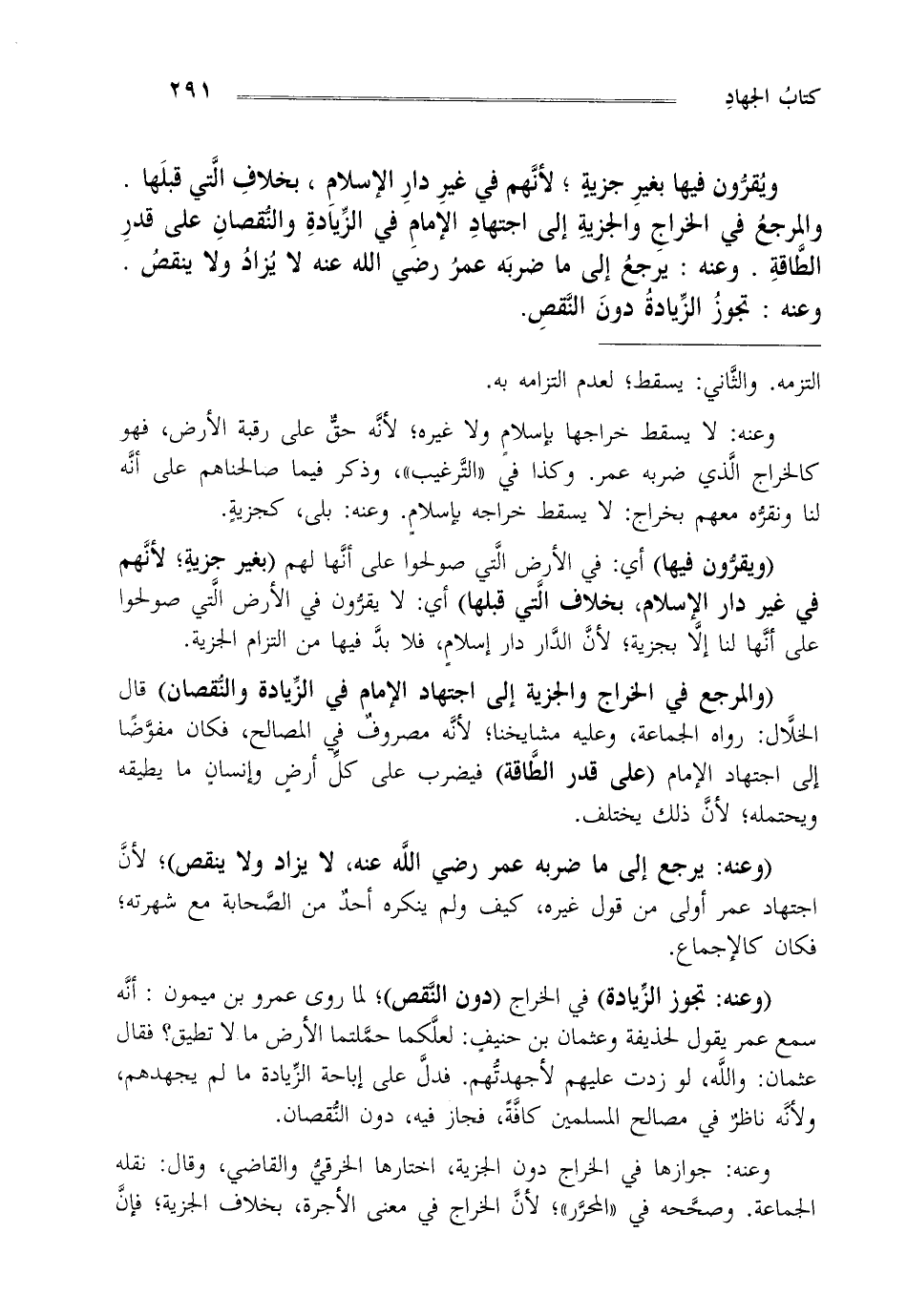 "والمرجع في الخراج والجزية إلى اجتهاد الإمام في الزيادة والنقصان" قال الخلال: رواه الجماعة وعليه مشايخنا لأنه مصروف في المصالح فكان مفوضا إلى اجتهاد الإمام "على قدر الطاقة" فيضرب على كل أرض وإنسان ما يطيقه ويحتمله لأن ذلك يختلف.