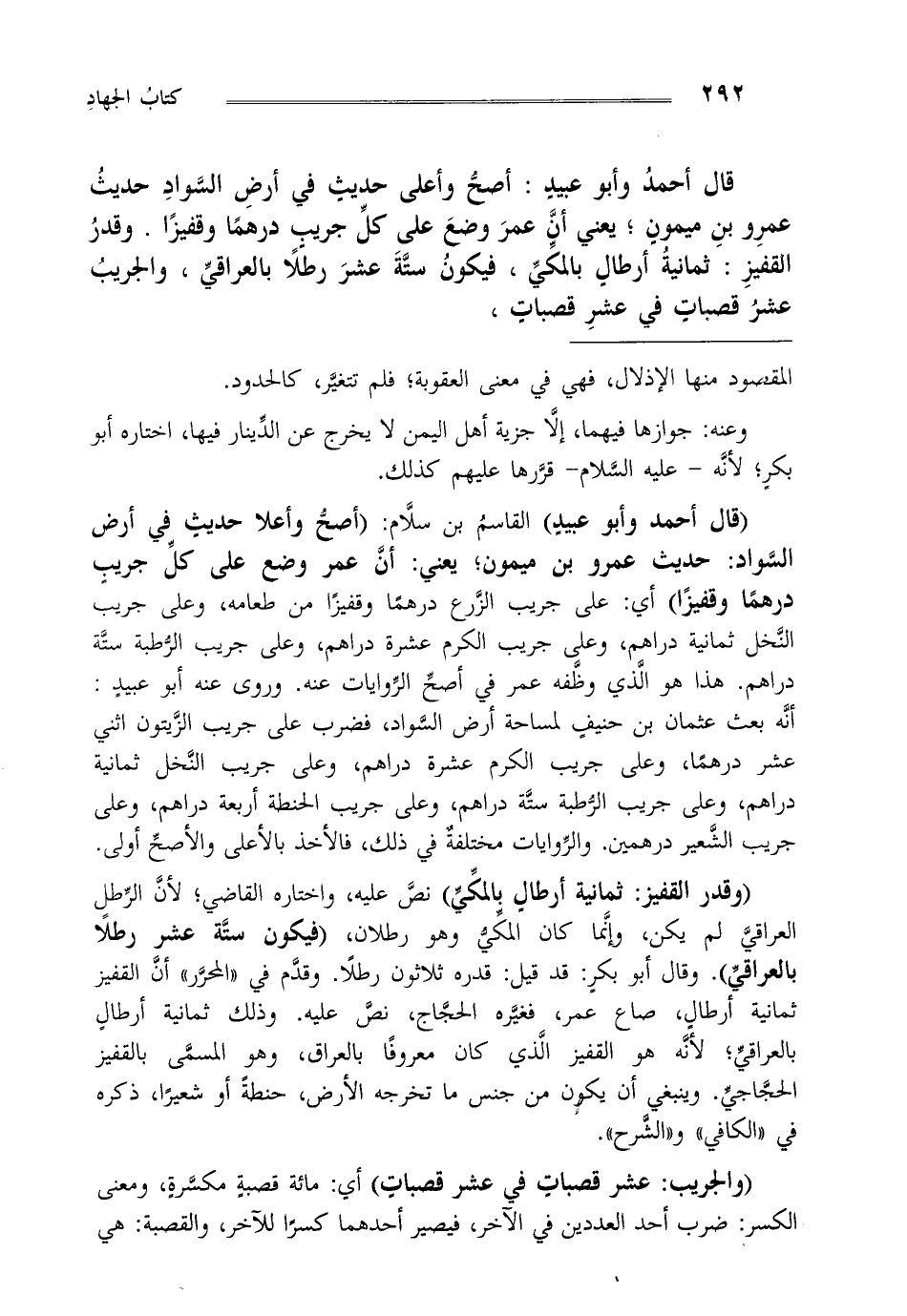 قال أحمد وأبو عبيد: أصح وأعلا حديث في حديث عمرو بن ميمون يعني أن عمر وضع على كل جريب درهما وقفيزا وقدر القفيز ثمانية أرطال بالمكي فيكون ستة عشر رطلا بالعراقي والجريب عشر قصبات في عشر قصبات،