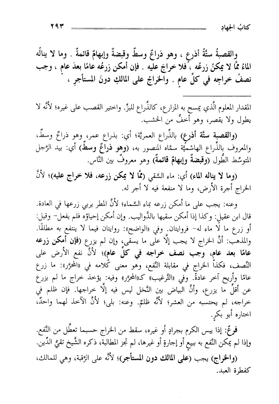 والقصبة ستة أذرع وهو ذراع وسط وقبضة وإبهام قائمة وما لا يناله الماء مما لا يمكن زرعه فلا خراج عليه فإن أمكن زرعه عاما بعد عام وجب نصب خراجه في كل عام والخراج على المالك دون المستأجر،