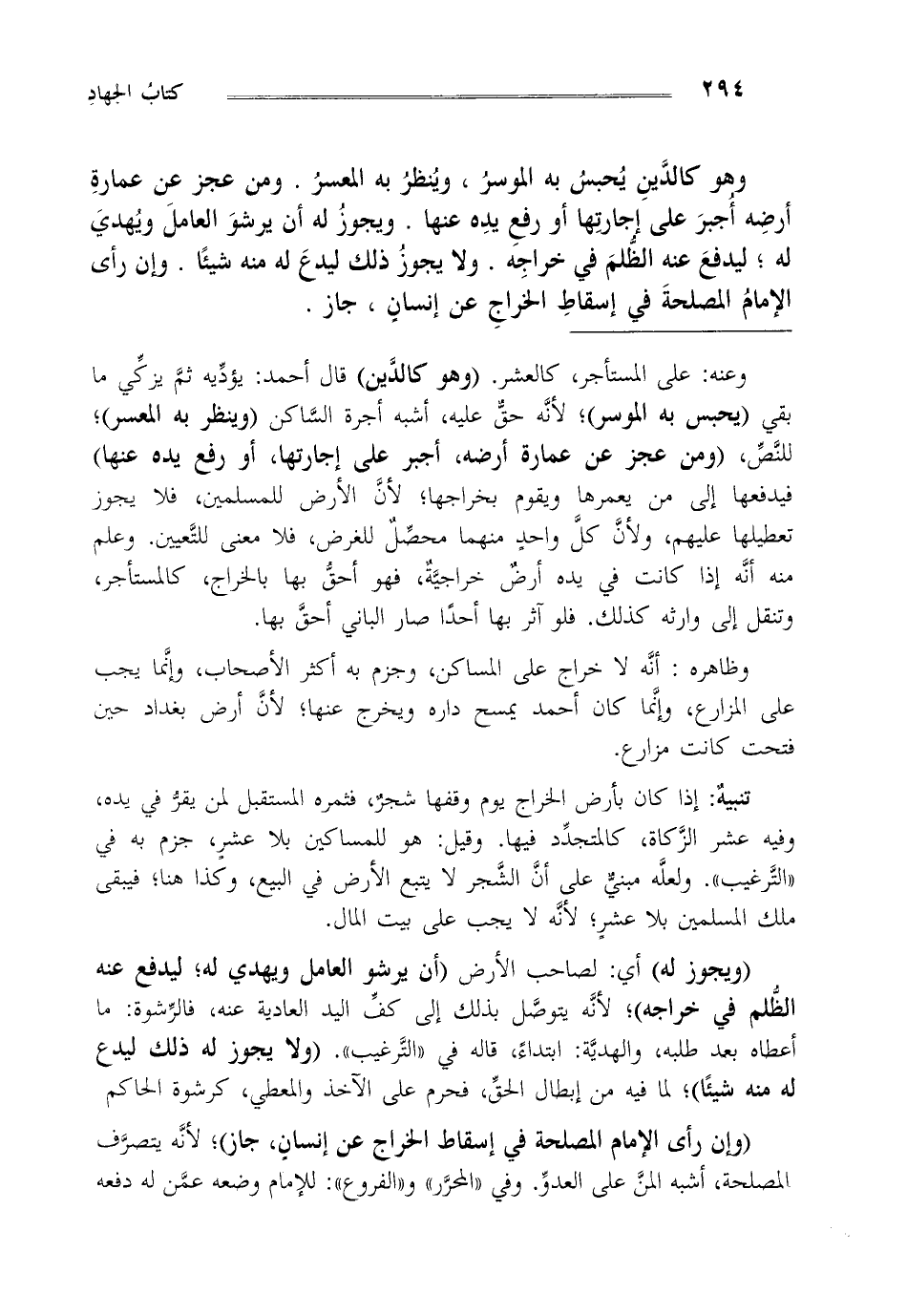 وعنه: على المستأجر كالعشر "وهو كالدين" قال أحمد: يؤديه ثم يزكي ما بقي يحبس به الموسر لأنه حق عليه أشبه أجرة الساكن "وينظر به المعسر"، للنص، "ومن عجز عن عمارة أرضه أجبر على إجارتها أو رفع يده عنها" فيدفعها إلى من يعمرها ويقوم بخراجها لأن الأرض للمسلمين فلا يجوز تعطيلها عليهم ولأن كل واحد منهما محصل للغرض فلا معنى للتعيين وعلم منه أنه إذا كانت في يده أرض خراجية فهو أحق بها بالخراج كالمستأجر وتنقل إلى وارثه كذلك فلو آثر بها أحدا صار الباني أحق بها.