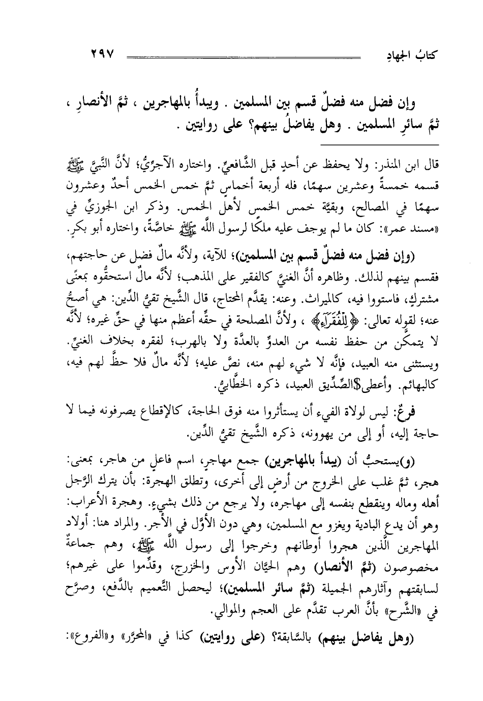"و" يستحب أن "يبدأ بالمهاجرين" جمع مهاجر اسم فاعل من هاجر بمعنى هجر ثم غلب على الخروج من أرض إلى أخرى وتطلق الهجرة بأن يترك الرجل أهله وماله وينقطع بنفسه إلى مهاجره ولا يرجع من ذلك بشيء وهجرة الأعراب وهو أن يدع البادية ويغزو مع المسلمين وهي دون الأول في الأجر والمراد هنا أولاد المهاجرين الذين هجروا أوطانهم وخرجوا إلى رسول الله صلى الله عليه وسلم وهم جماعة مخصوصون "ثم الأنصار" وهم الحيان الأوس والخزرج وقدموا على غيرهم لسابقتهم وآثارهم الجميلة "ثم سائر المسلمين"، ليحصل التعميم بالدفع وصرح في الشرح بأن العرب تقدم على العجم والموالي.