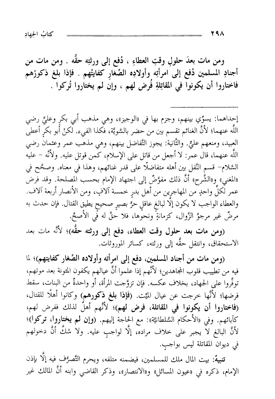 "ومن مات من أجناد المسلمين دفع إلى امرأته و أولاده الصغار كفايتهم"، لما فيه من تطييب قلوب المجاهدين لأنهم إذا علموا أن عيالهم يكفون المؤونة بعد موتهم توفروا على الجهاد بخلاف عكسه فإن تزوجت المرأة أو واحدة من البنات سقط فرضها لأنها خرجت عن عيال الميت. "فإذا بلغ ذكورهم" وكانوا أهلا للقتال "فاختاروا أن يكونوا في المقابلة فرض لهم"، لأنهم أهل لذلك ففرض لهم كآبائهم وفي "الأحكام السلطانية": مع الحاجة إليهم. "وإن لم يختاروا تركوا"، لأن البالغ لا يجبر على خلاف مراده إلا لواجب عليه ولا شك أن دخولهم في ديوان المقاتلة ليس بواجب.