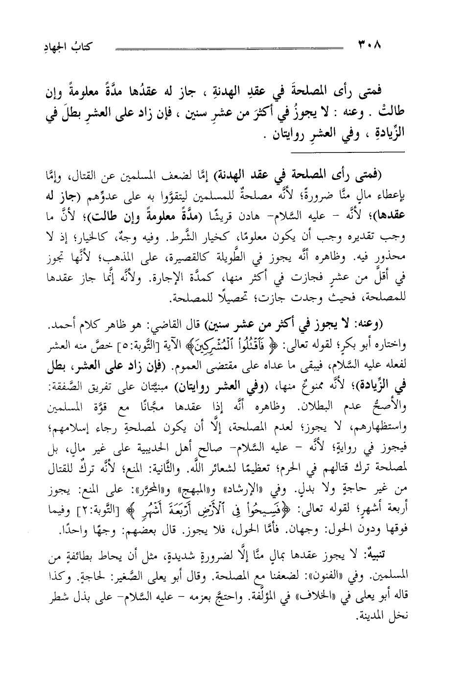 "وعنه: لا يجوز في أكثر من عشر سنين" قال القاضي هو ظاهر كلام أحمد واختاره أبو بكر لقوله تعالى: {فَاقْتُلُوا الْمُشْرِكِينَ} الآية [التوبة: 5] خص منه العشر لفعله عليه السلام فيبقى ما عداه على مقتضى العموم. "فإن زاد على العشر بطل في الزيادة"، لأنه ممنوع منها، "وفي العشر روايتان" مبنيتان على تفريق الصفقة والأصح عدم البطلان وظاهره أنه إذا عقدها مجانا مع قوة المسلمين واستظهارهم لا يجوز لعدم المصلحة إلا أن يكون لمصلحة رجاء إسلامهم فيجوز في رواية لأنه عليه السلام صالح أهل الحديبية على غير مال بل لمصلحة ترك قتالهم في الحرم تعظيما لشعائر الله والثانية المنع لأنه ترك للقتال من غير حاجة ولا بدل. وفي "الإرشاد" و"المبهج" و"المحرر": على المنع: يجوز أربعة أشهر لقوله تعالى: {فَسِيحُوا فِي الْأَرْضِ أَرْبَعَةَ أَشْهُرٍ} [التوبة: 2] وفيما فوقها ودون الحول وجهان فأما الحول فلا يجوز قال بعضهم وجها واحدا.