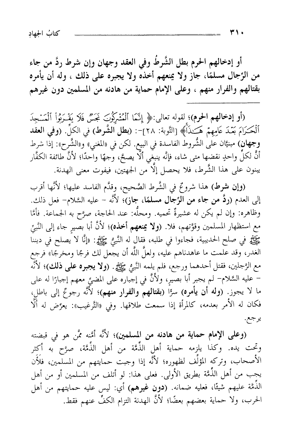 "وإن شرط" هذا شروع في الشرط الصحيح وقدم الفاسد عليها لأنها أقرب إلى العدم "رد من جاء من الرجال مسلما، جاز"، لأنه عليه السلام فعل ذلك وظاهره وإن لم يكن له عشيرة تحميه ومحله عند الحاجة صرح به الجماعة فأما مع استظهار المسلمين وقوتهم فلا. "ولا يمنعهم أخذه"، لأن أبا بصير جاء إلى النبي صلى الله عليه وسلم في صلح الحديبية فجاءوا في طلبه فقال له النبي صلى الله عليه وسلم: "إنا لا يصلح في ديننا الغدر وقد علمت ما عاهدناهم عليه ولعل الله أن يجعل لك فرجا ومخرجا" فرجع مع الرجلين فقتل أحدهما ورجع فلم يلمه النبي صلى الله عليه وسلم. "ولا يجبره على ذلك"، لأنه عليه السلام لم يجبر أبا بصير ولأن في إجباره على المضي معهم إجبارا له على ما لا يجوز "وله أن يأمره" سرا "بقتالهم والفرار منهم"، لأنه رجوع إلى باطل فكان له الأمر بعدمه كالمرأة إذا سمعت طلاقها وفي "الترغيب": يعرض له أن لا يرجع.