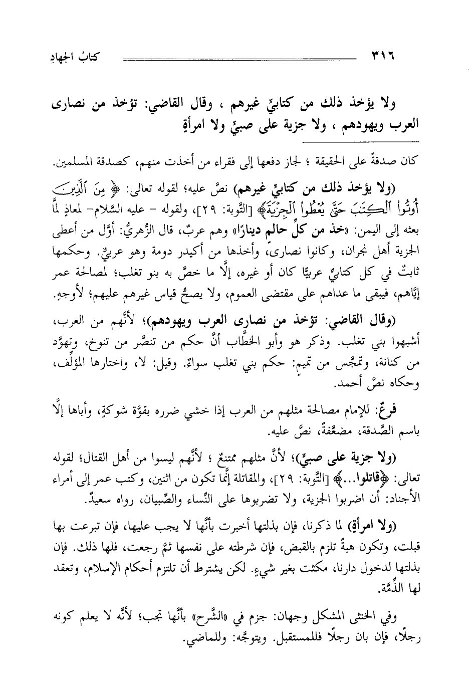 "وقال القاضي: تؤخذ من نصارى العرب ويهودهم"، لأنهم من العرب أشبهوا بني تغلب وذكر هو و أبو الخطاب أن حكم من تنصر من تنوخ وتهود من كنانة وتمجس من تميم حكم بني تغلب سواء وقيل لا واختارها المؤلف وحكاه نص أحمد.