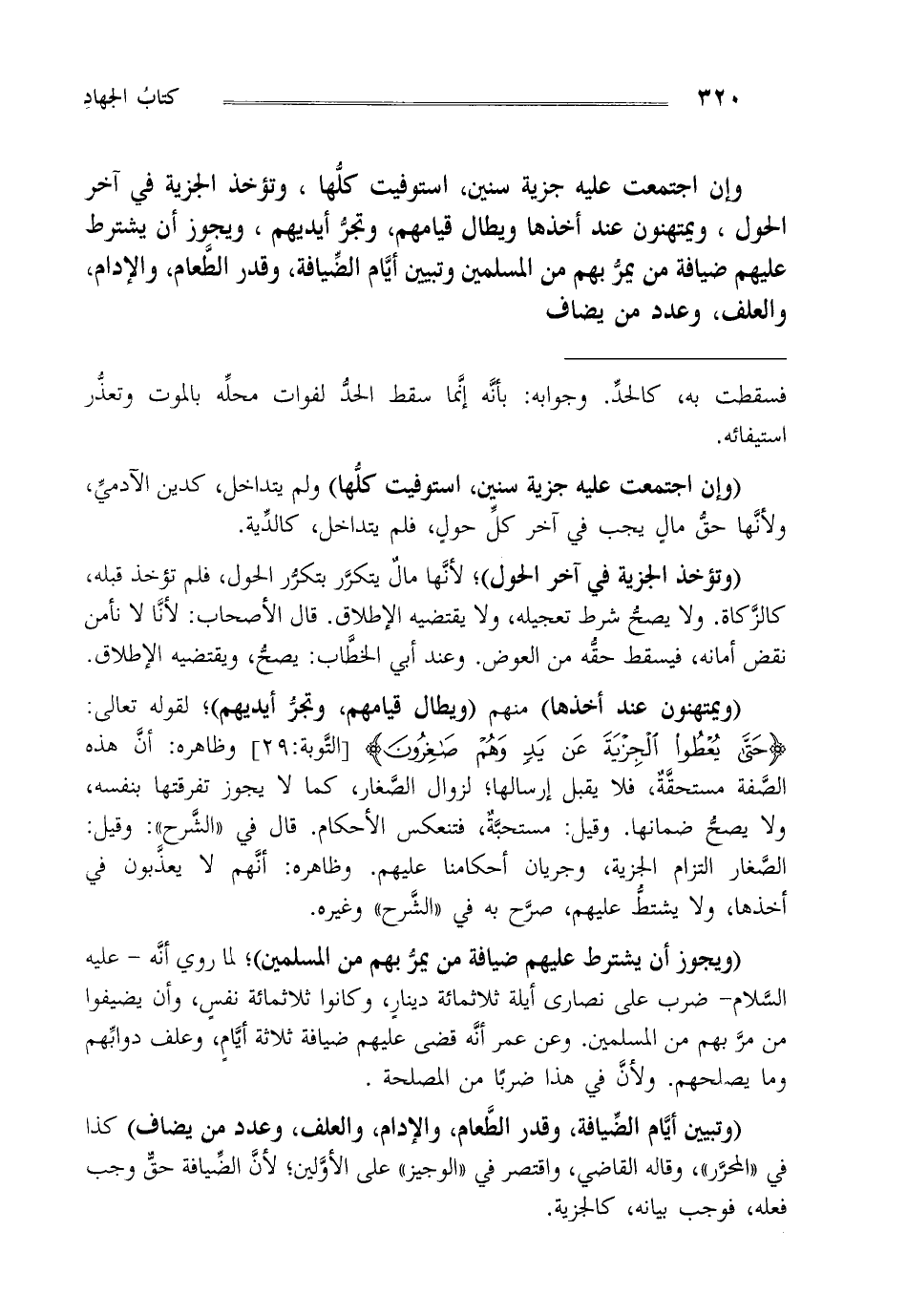 وإن اجتمعت عليه جزية سنين استوفيت كلها وتؤخذ الجزية في آخر الحول ويمتهنون عند أخذها ويطال قيامهم وتجر أيديهم ويجوز أن يشترط عليهم ضيافة من يمر بهم من المسلمين وتبين أيام الضيافة وقدر الطعام و الإدام والعلف وعدد من يضاف