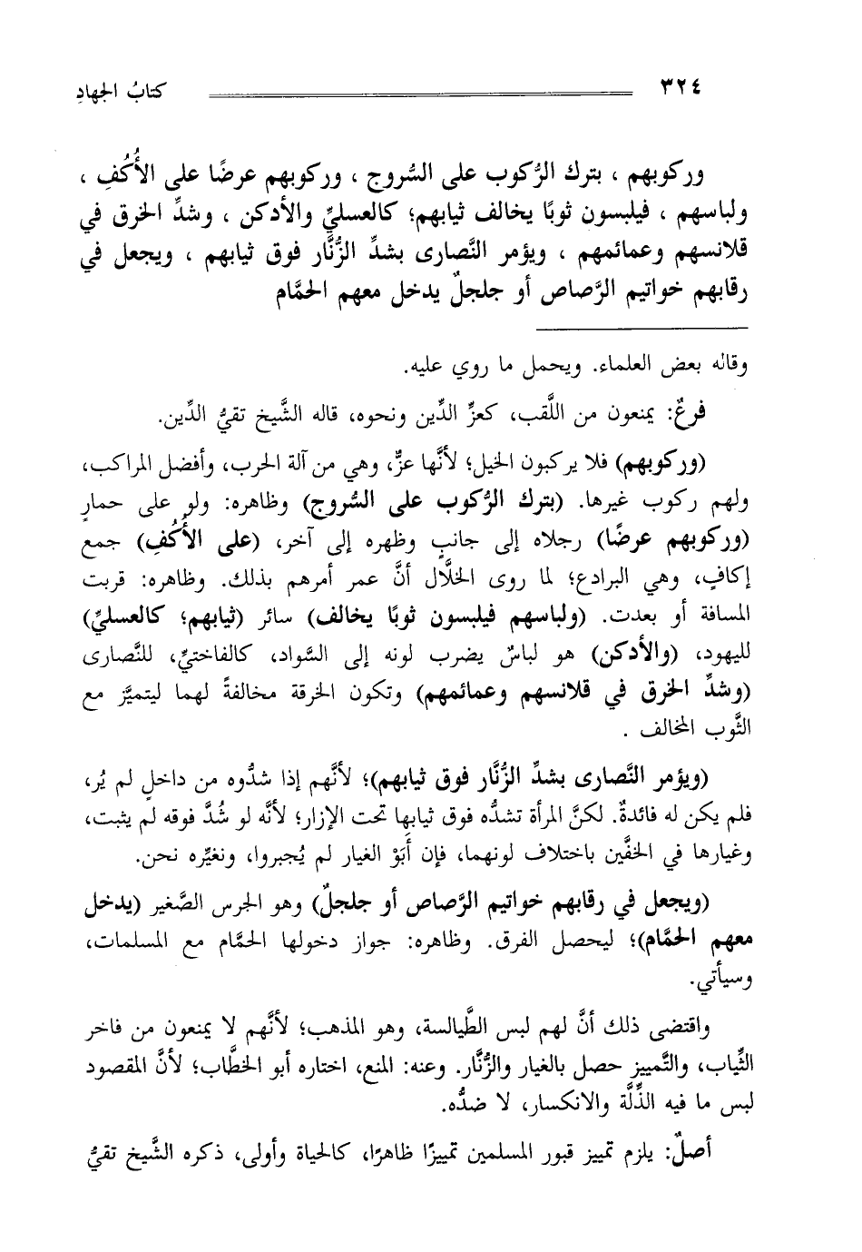 "وركوبهم" فلا يركبون الخيل لأنها عز وهي من آله الحرب و أفضل المراكب ولهم ركوب غيرها. "بترك الركوب على السروج" وظاهره: ولو على حمار "وركوبهم عرضا" رجلاه إلى جانب وظهره إلى آخر "على الأكف" جمع إكاف وهي البرادع لما روى الخلال أن عمر أمرهم بذلك وظاهره قربت المسافة أو بعدت "لباسهم فيلبسون ثوبا يخالف" سائر "ثيابهم كالعسلي" لليهود "والأدكن" هو لباس يضرب لونه إلى السواد كالفاختي للنصارى "وشد الخرق في قلانسهم وعمائمهم" وتكون الخرقة مخالفة لهما ليتميز مع الثوب المخالف.
