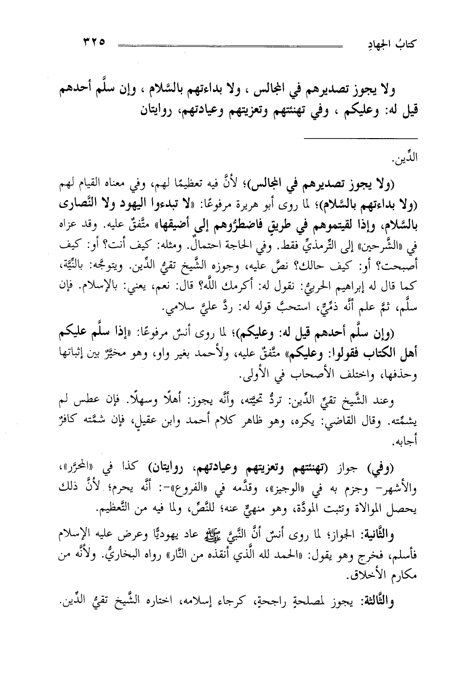 ولا يجوز تصديرهم في المجالس ولا بداءتهم بالسلام وإن سلم أحدهم قيل له وعليكم وفي تهنئتهم وتعزيتهم وعيادتهم روايتان