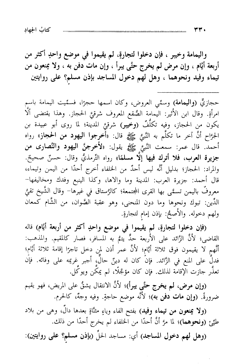 حجازي "واليمامة" وسمي العروض وكان اسمها حجرا فسميت اليمامة باسم امرأة وقال ابن الأثير اليمامة الصقع المعروف شرقي الحجاز وهذا يقتضي أن لا يكون من الحجاز وفيه تكلف "وخيبر" شرقي المدينة لما روى أبو عبيدة بن الجراح أن آخر ما تكلم به النبي صلى الله عليه وسلم قال: "أخرجوا اليهود من الحجاز" رواه أحمد قال عمر سمعت النبي صلى الله عليه وسلم يقول: "لأخرجن اليهود والنصارى من جزيرة العرب فلا أترك فيها إلا مسلما" رواه الترمذي وقال: حسن صحيح والمراد الحجاز بدليل أنه ليس أحد من الخلفاء أخرج أحدا من اليمن وتيماء قال أحمد جزيرة العرب المدينة وما والاها وكذا الينبع وفدك ومخاليفها معروف باليمن تسمى بها القرى المجتمعة كالرستاق في غيرها وقال الشيخ تقي الدين تبوك ونحوها وما دون المنحنى وهو عقبة الصوان من الشام كمعان ولهم دخوله والأصح بإذن إمام لتجارة.