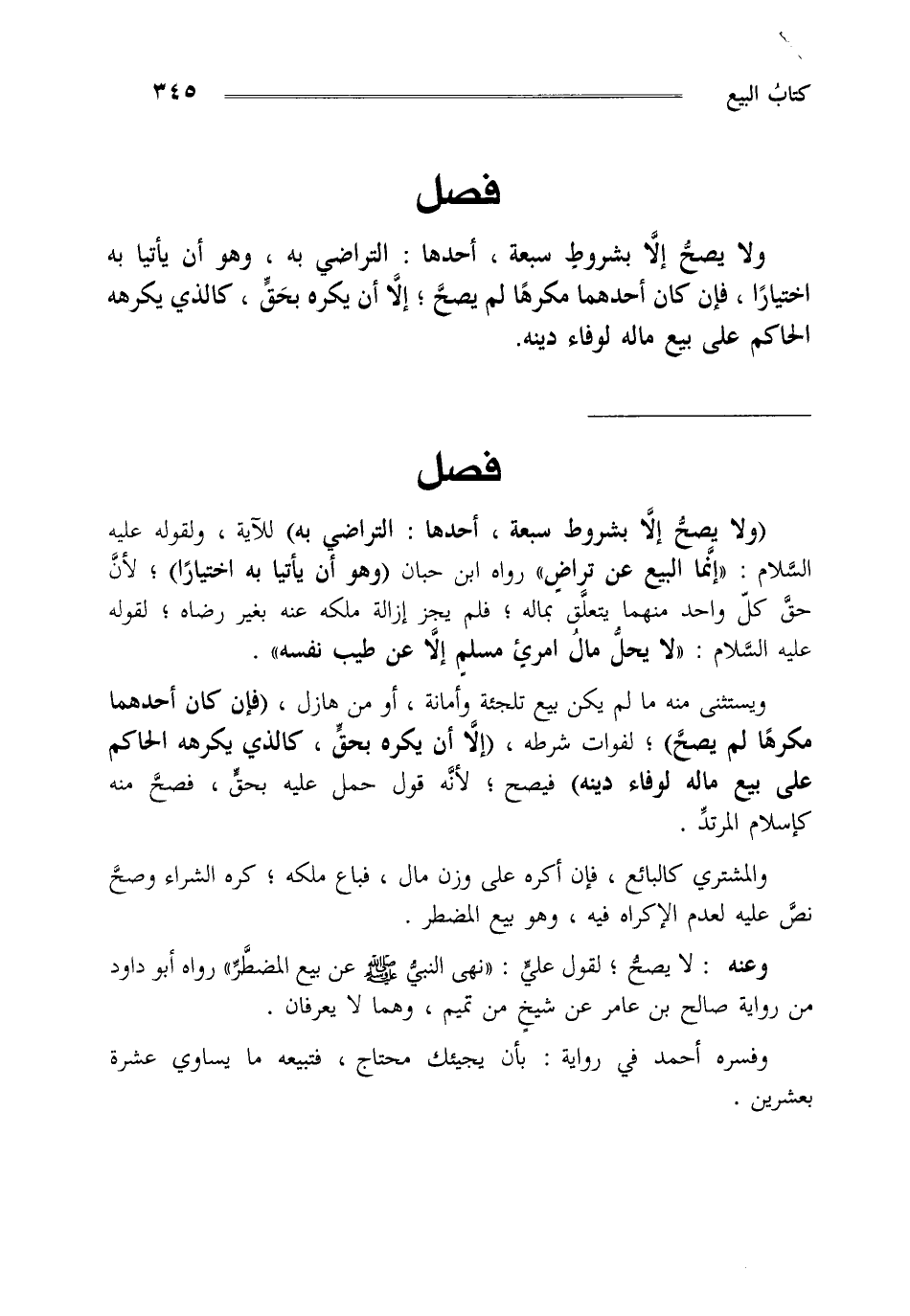 "ولا يصح إلا بشروط سبعة أحدها التراضي به" للآية ولقوله عليه السلام: "إنما البيع عن تراض" رواه ابن حبان "وهو أن يأتيا به اختيارا"، لأن حق كل واحد منهما يتعلق بماله فلم يجز إزالة ملكه عنه بغير رضاه لقوله عليه السلام: "لا يحل مال امرئ مسلم إلا عن طيب نفسه".